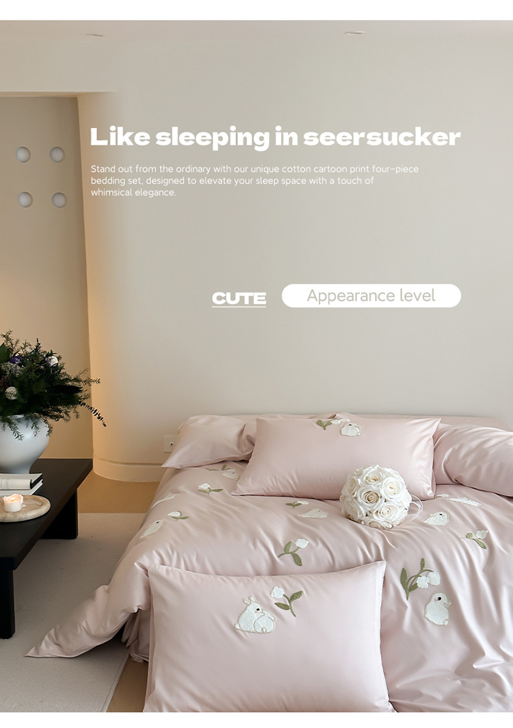 かわいいウサギのウサギの100sの長い綿の漫画の風の純綿の4セットの小さい清新なハイエンドの子供の寝具の卸売り