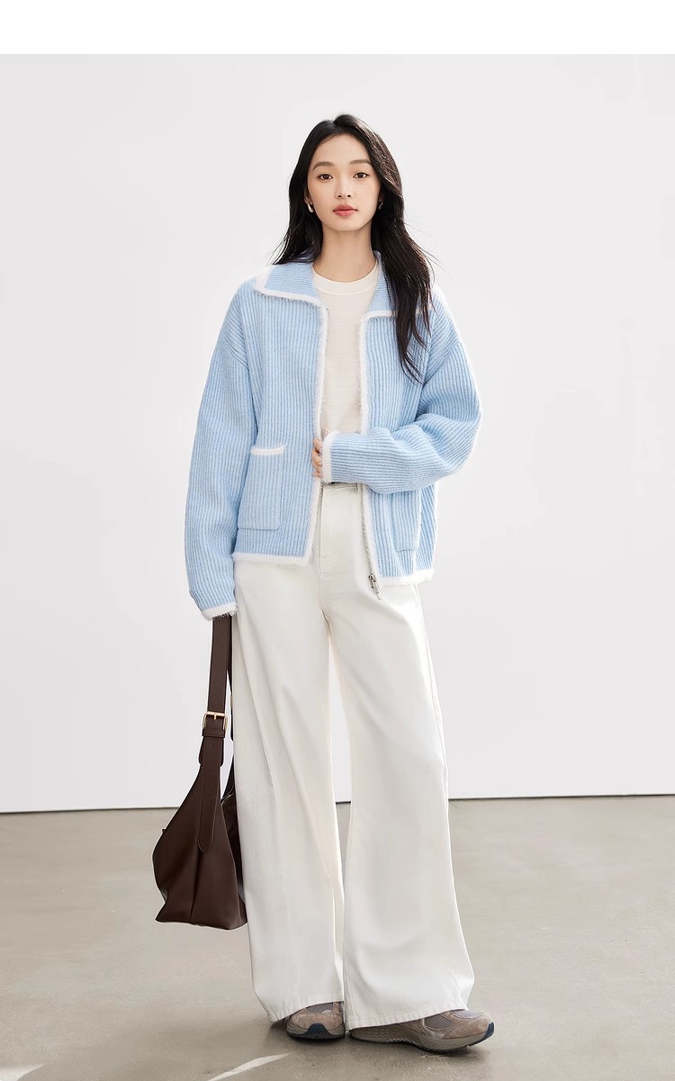 秋季新款韩系百搭针织开衫宽松洋气优雅简约风优质翻领毛衣女外套