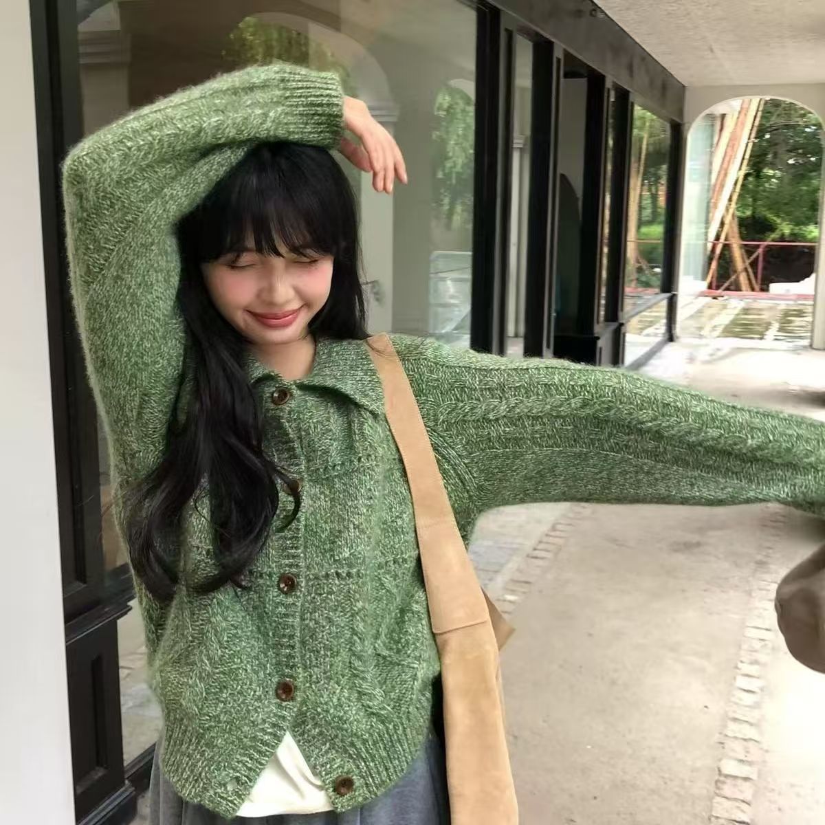 复古风毛衣女韩系百搭宽松2025早秋新款外套麻花翻领混纺针织开衫