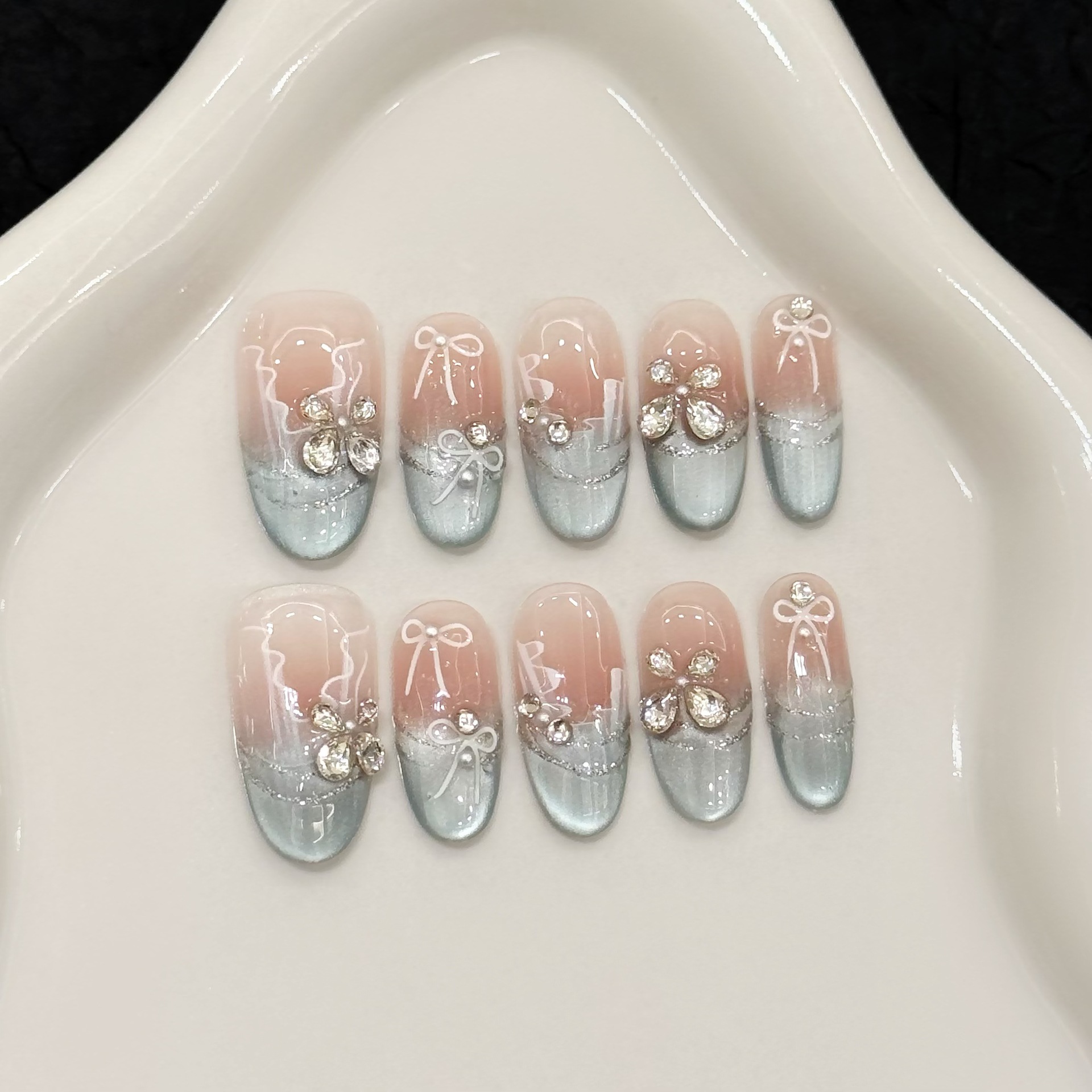 艺禾穿戴甲【miu系少女】纯欲公主波点蝴蝶结短款手工猫眼美甲贴
