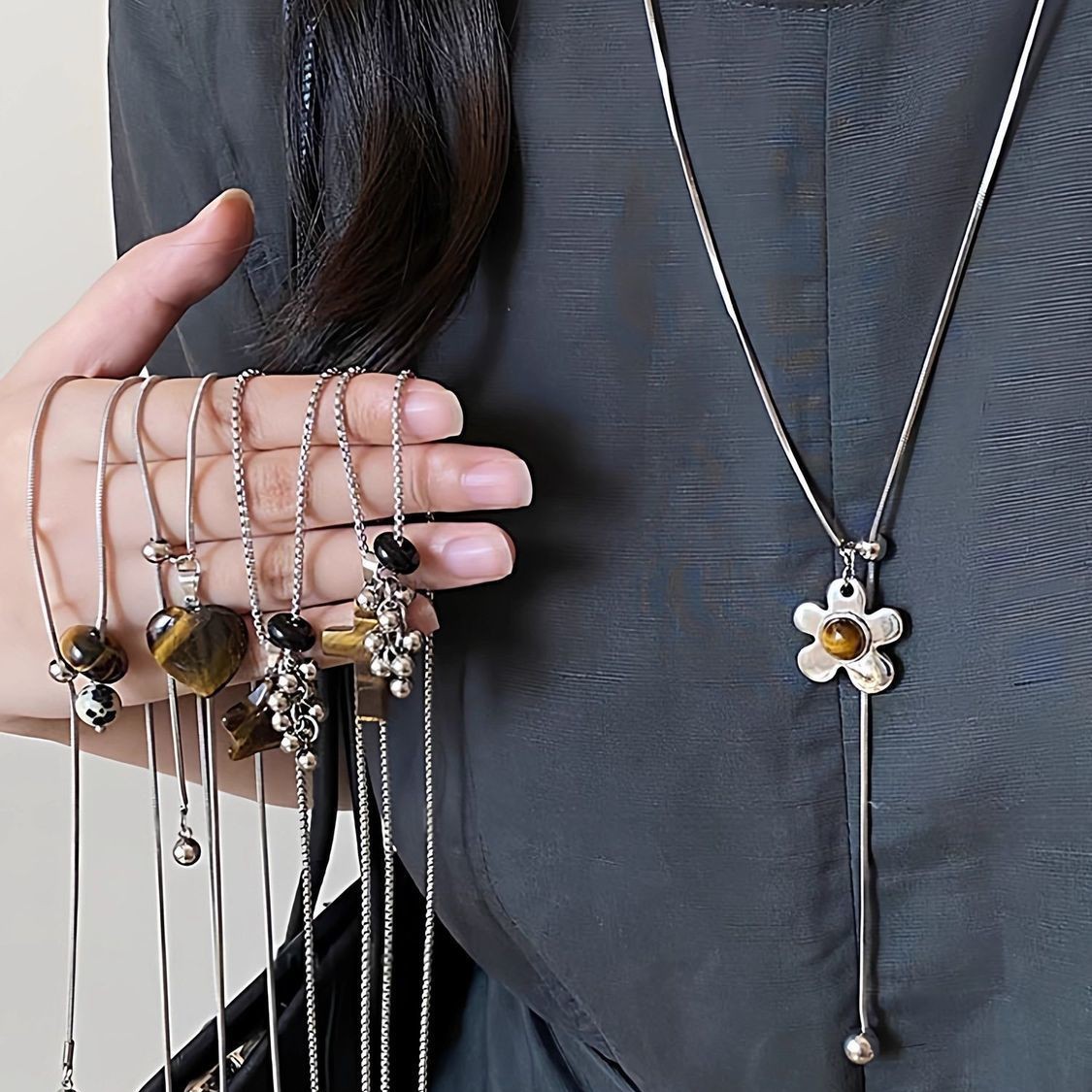 自留通勤款!秋冬长款虎眼石吊坠装饰项链女配饰可调节毛衣链