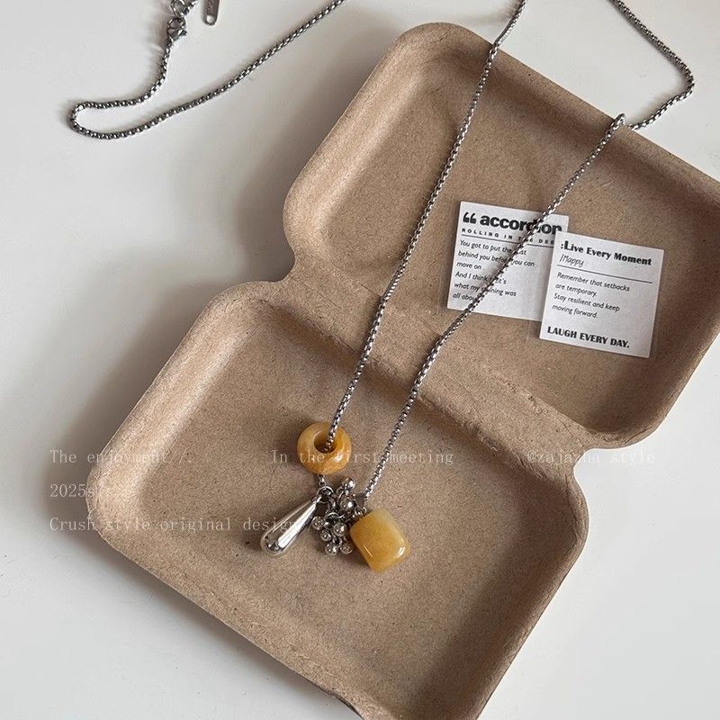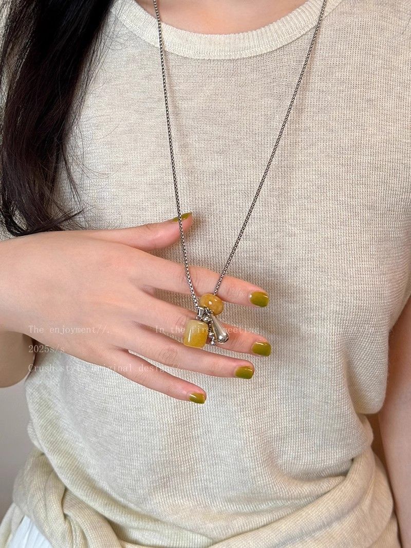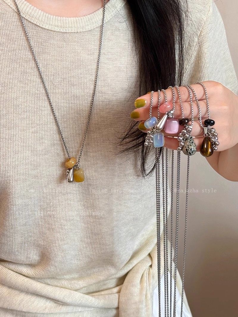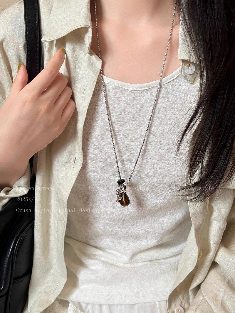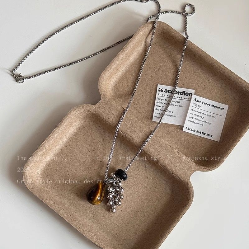 チタン鋼タイガーアイストーンロングネックレスレディースサマーニッチハイエンドセーターチェーン天然石ブドウストリングペンダントメンズ