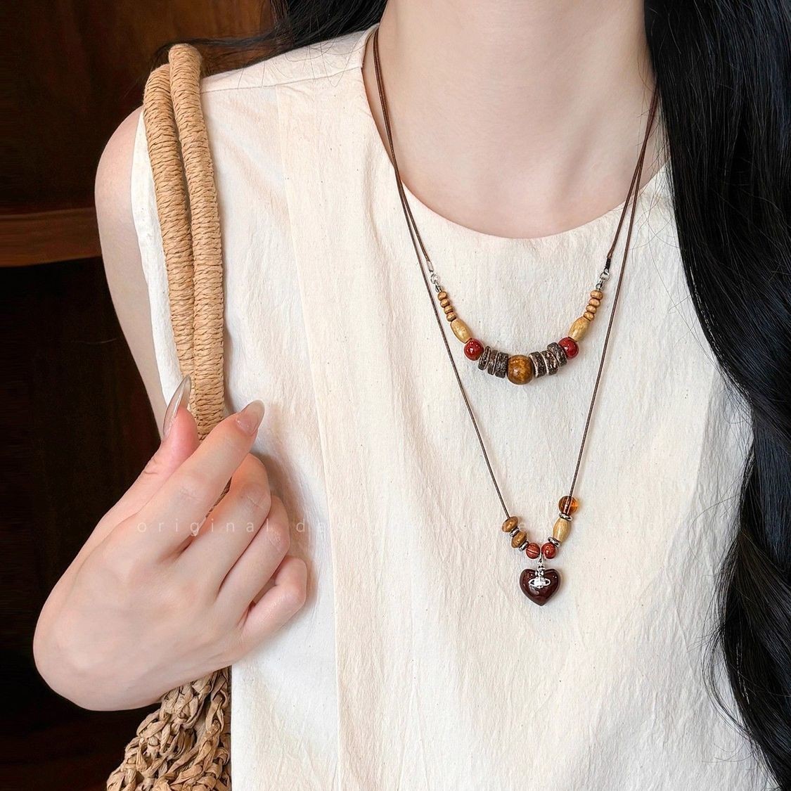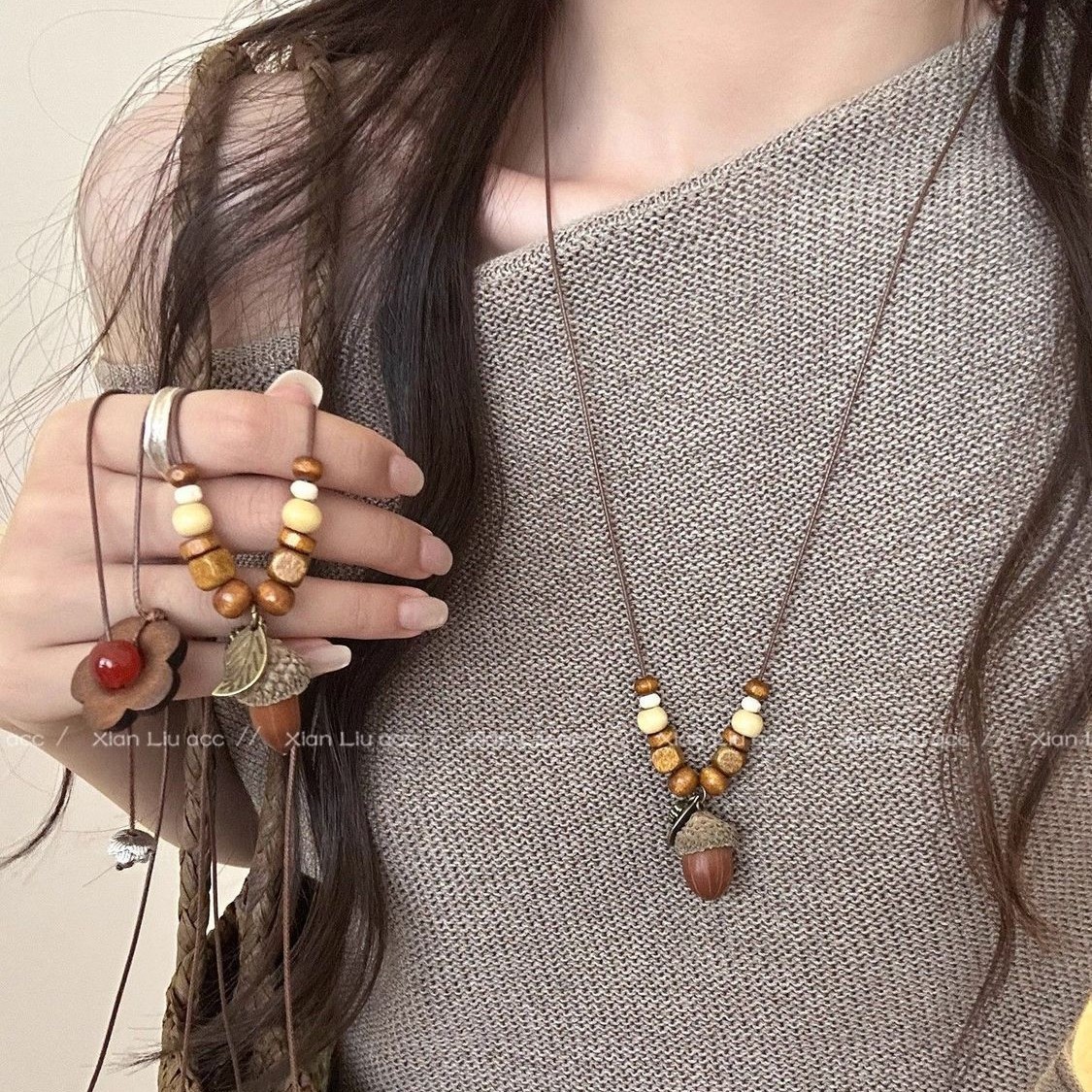 复古木质串珠吊坠项链女小众设计感民族风配饰时尚长款百搭毛衣链
