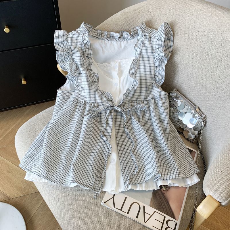 韓国チェック柄フェイクツーピースシャツレディースイヤリング付き年齢軽減ルーズノースリーブベビードールベストトップ