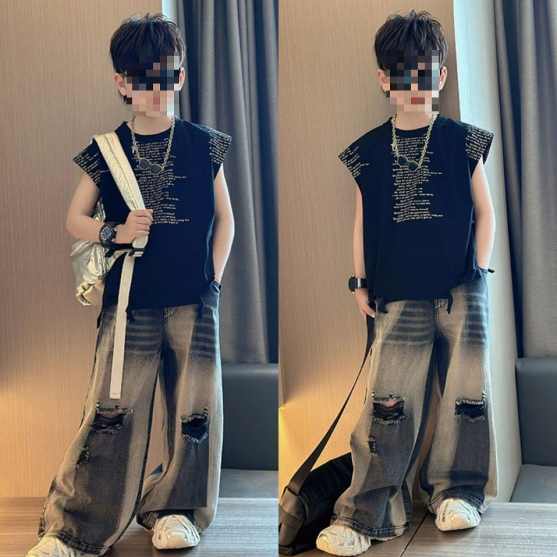 男の子の夏クールでハンサムな2025新しい中型および大型子供用コントラストカラーのリップドジーンズルーズパーソナライズされたチョッキベストスーツ