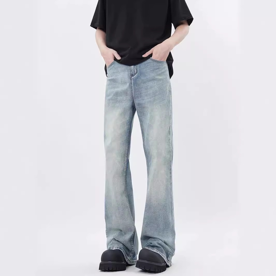 レトロブルーハイウエストジーンズメンズ春秋新作アメリカンハイストリートバイブパンツ背の高い人向けストレートレッグブーツカットパンツ