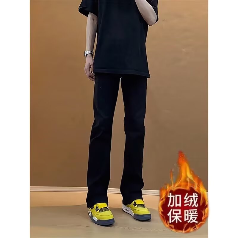 美式高街加绒牛仔裤秋冬季2025新款窄版修身微喇直筒休闲长裤男装