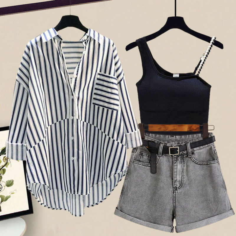 プラスサイズファットmmサマースーツフェミニンストライプ日焼け止めシャツ多用途サスペンダースリミングデニムショートパンツ3点セット