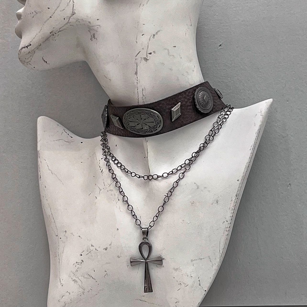 Choker美拉徳茶色皮質レトロ首輪二重十字架ローマリベットパンク百合ネックレス潮