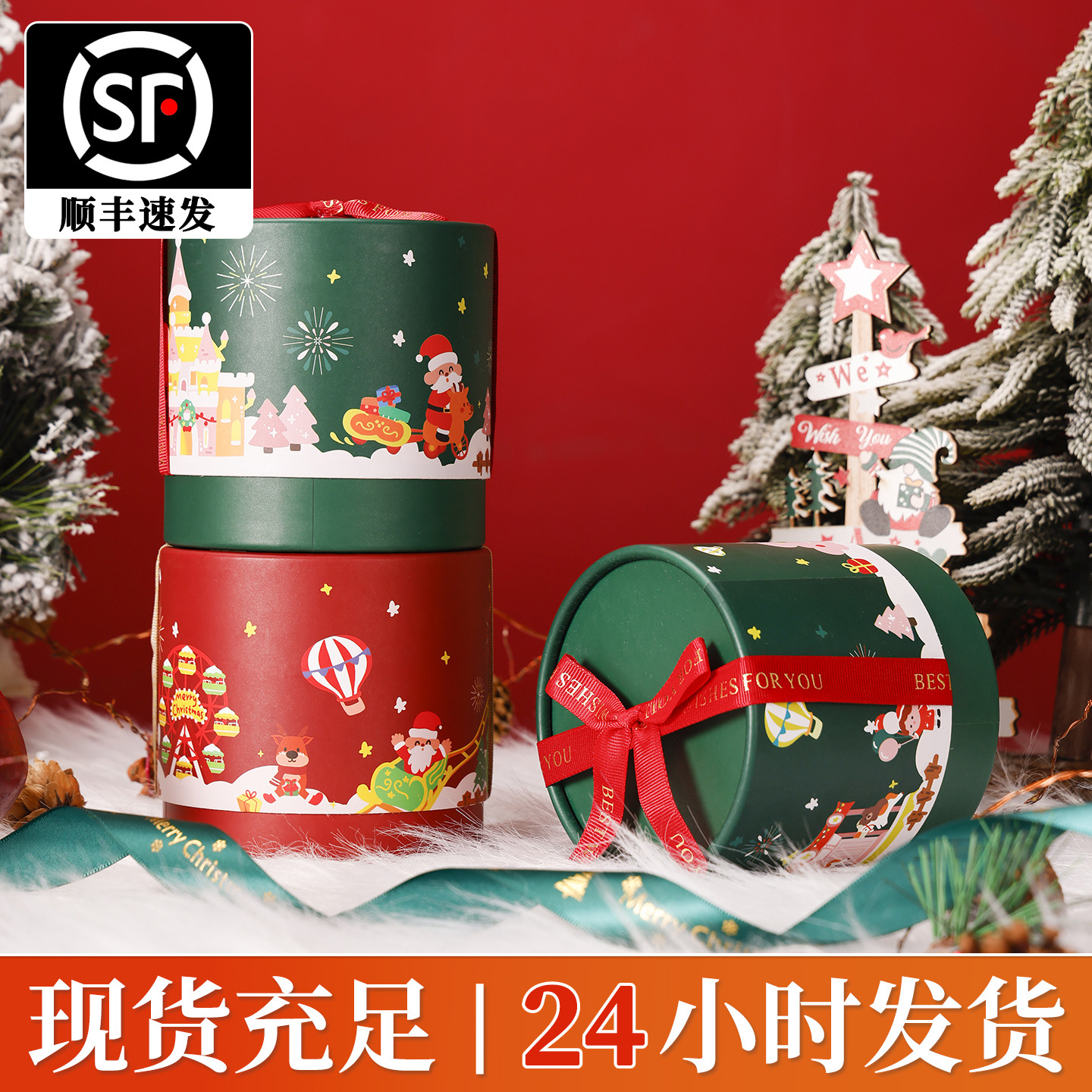 红色绿色圣诞节苹果盒精致圆桶圣诞糖果包装盒惊喜送人礼物空盒子