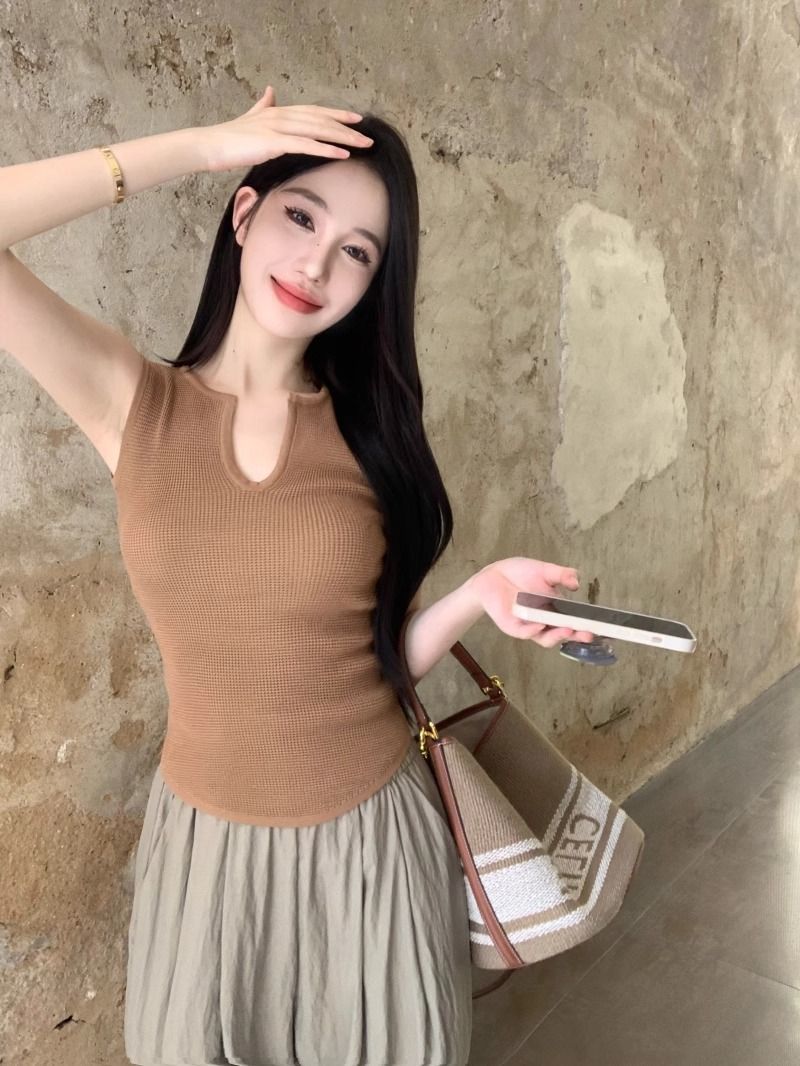 V ネックニットノースリーブベスト女性の夏の新しいフレンチスウィートガールカーブヘムスリムフィットアウタートップ