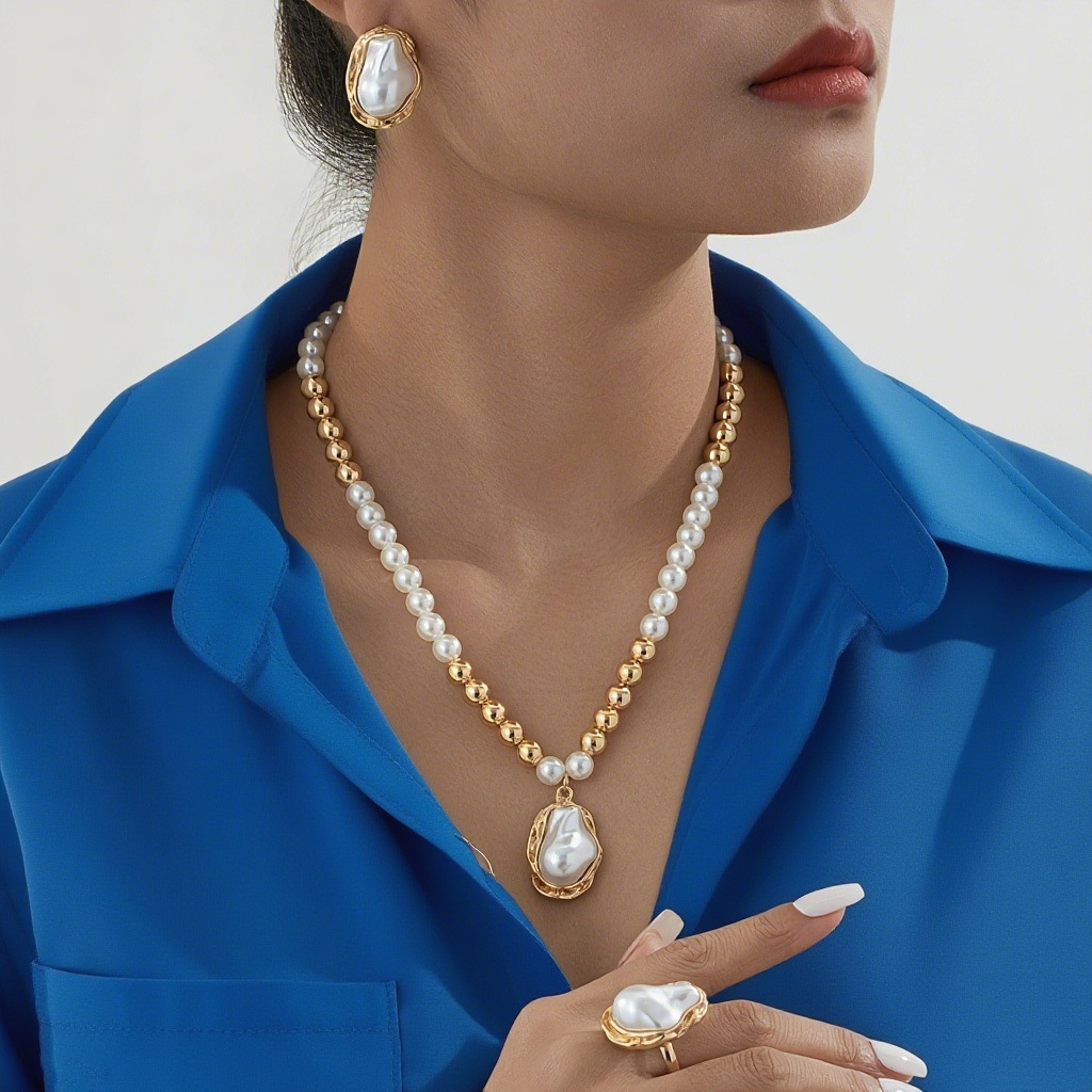 3件套欧美复古金属不规则仿珍珠串珠女士项链耳环戒指首饰套装