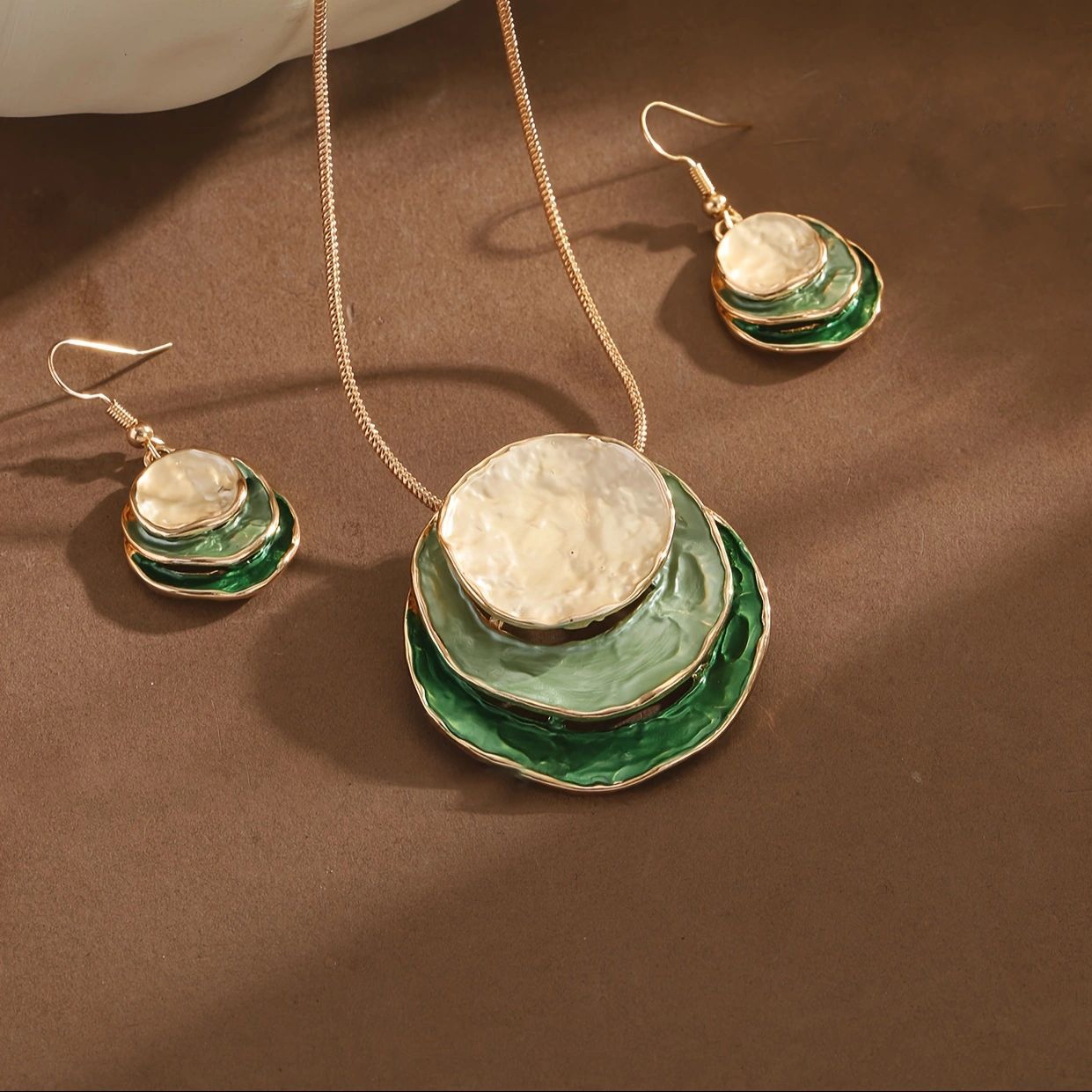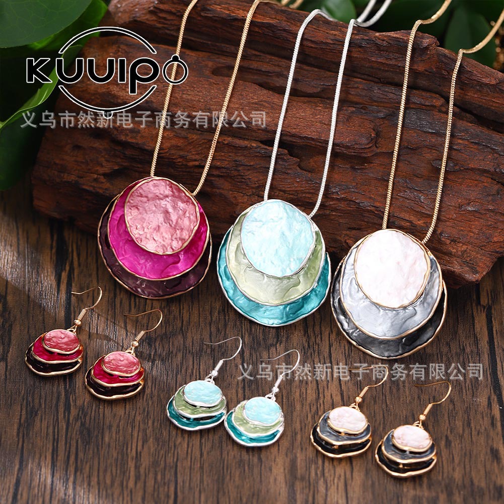 クリエイティブセット亜鉛合金幾何学円形三層カラードリップオイル高級感デザイン気質ネックレスイヤリングセット