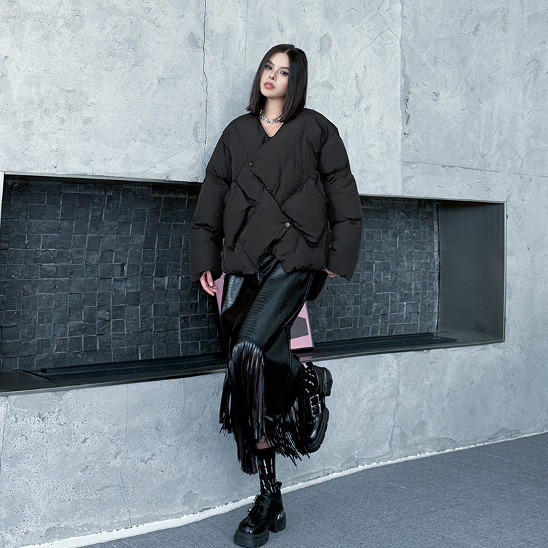 欧货高级感夹棉加厚V领棉服秋冬新款休闲百搭宽松不规则设计外套