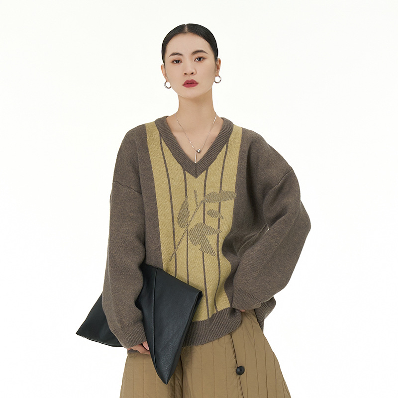 韓国の気質オリジナルコントラストカラー V ネックセーター 2025 春の新作大きいサイズの女性のルーズスリムトップ 8881