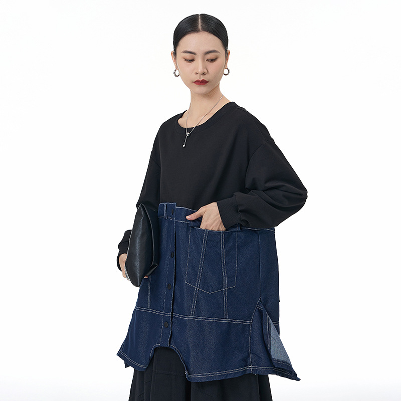韩系撞色牛仔拼接卫衣2025秋季新款大码女装宽松显瘦T恤潮32631