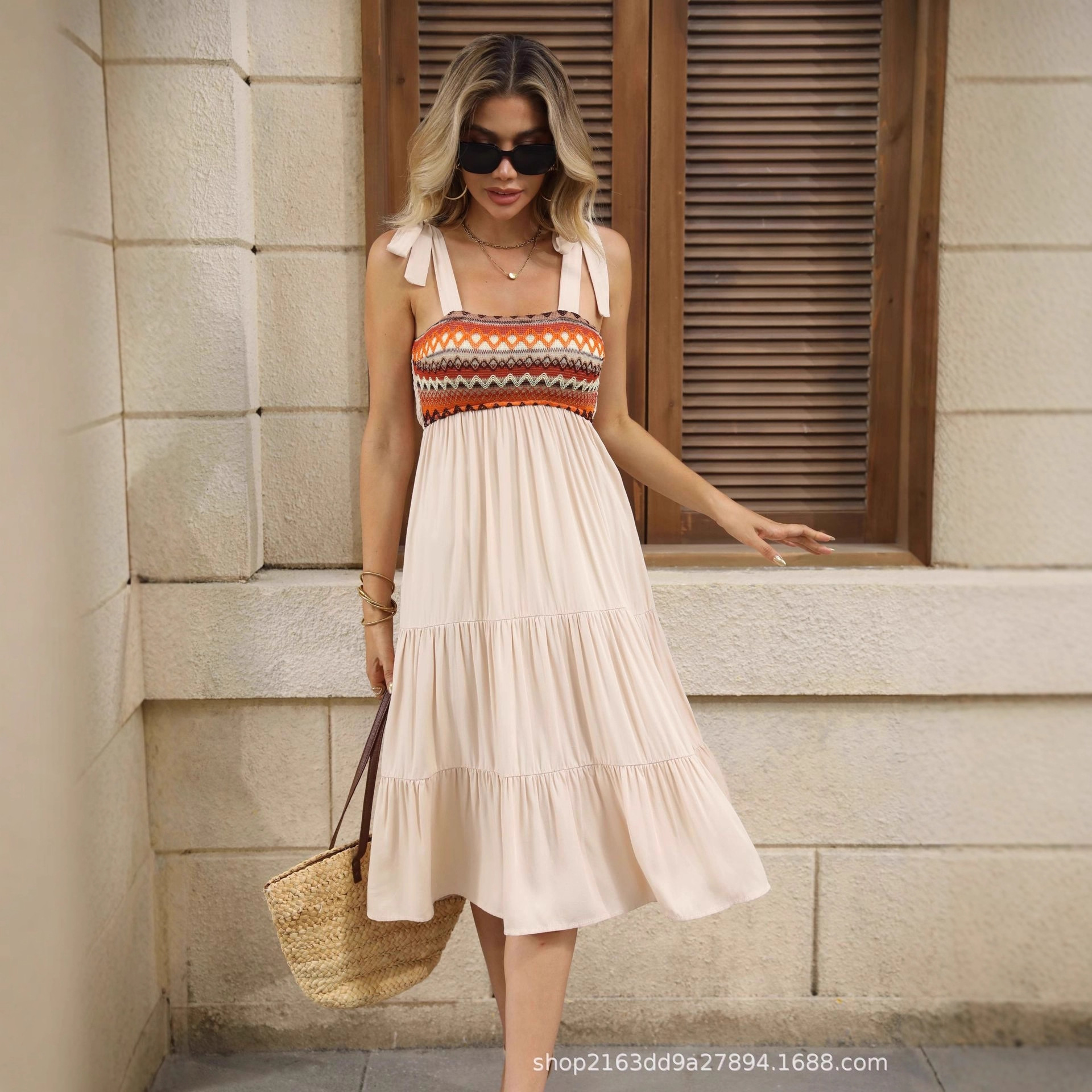 Amazonクロスボーダーヨーロッパとアメリカのドレス、ファッショナブルなレースアップサスペンダースカート、A裾ステッチエスニックスタイルドレス