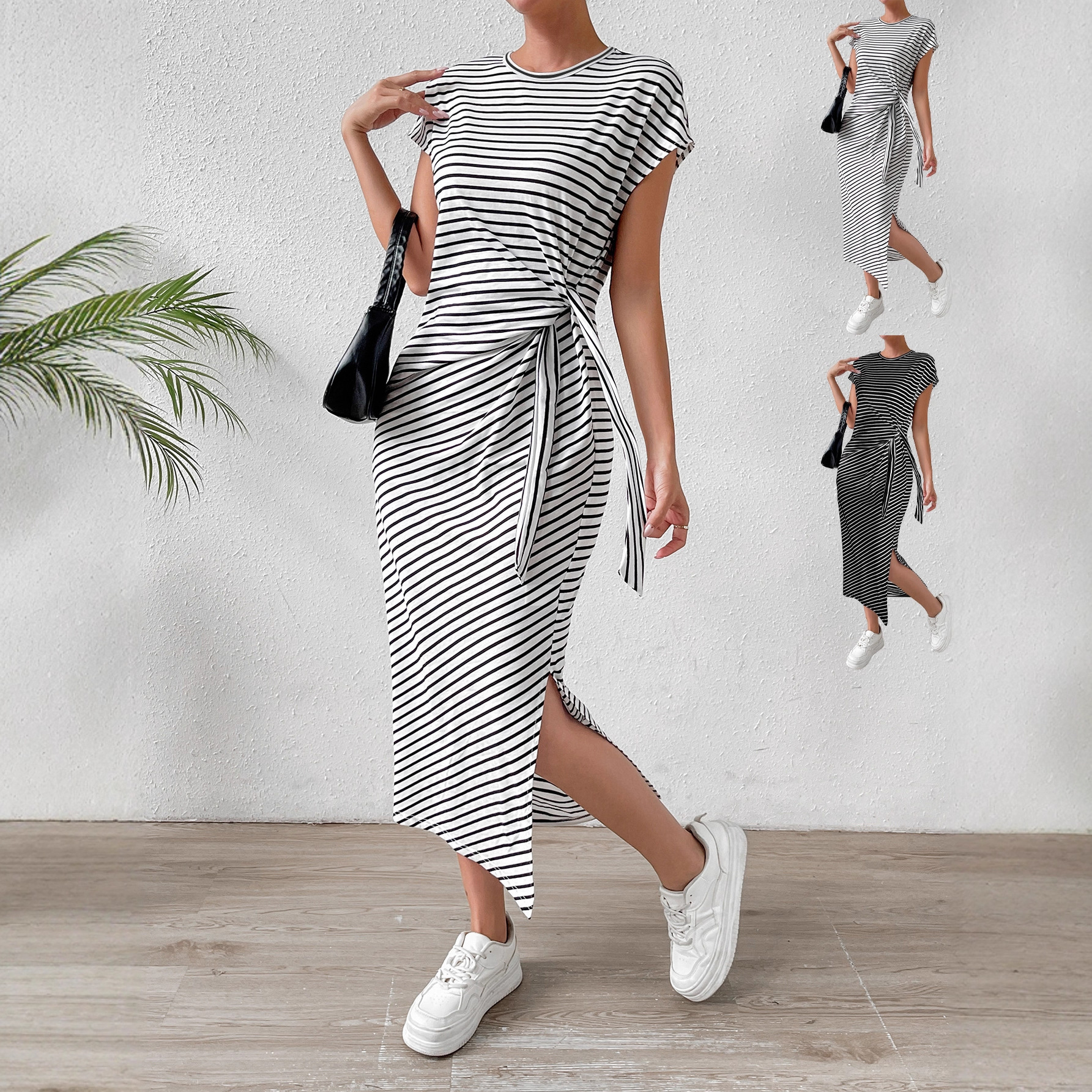 人気の独立系海外貿易アマゾンファッション婦人服、ラウンドネック、袖付き、半袖、ウエストベルト付き、スリット入りワンピース