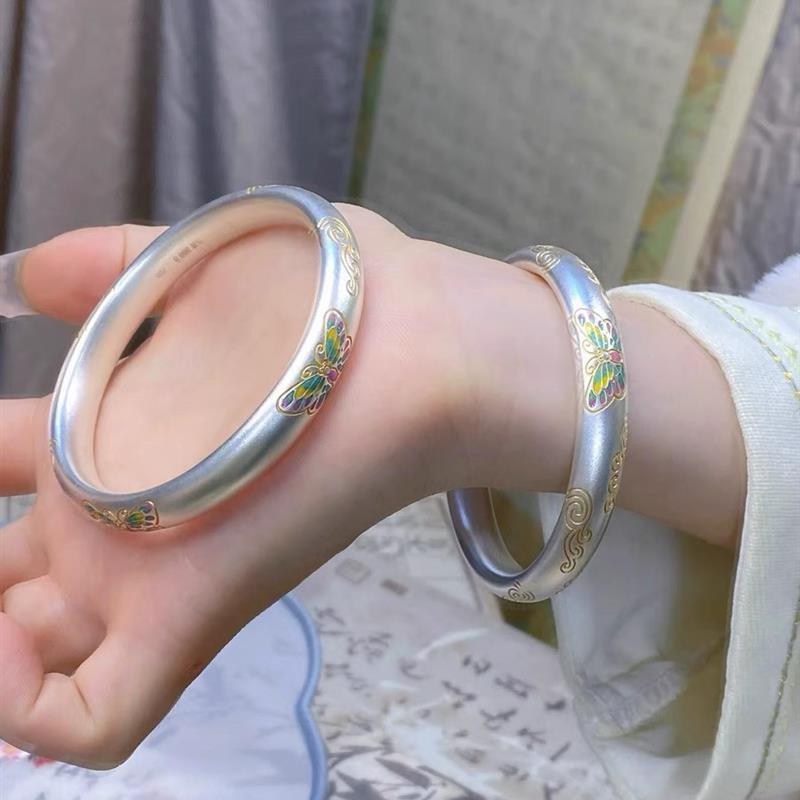 古法蝴蝶祥云银手镯女描金闭口镯子国潮磨砂新中式国风手环礼物
