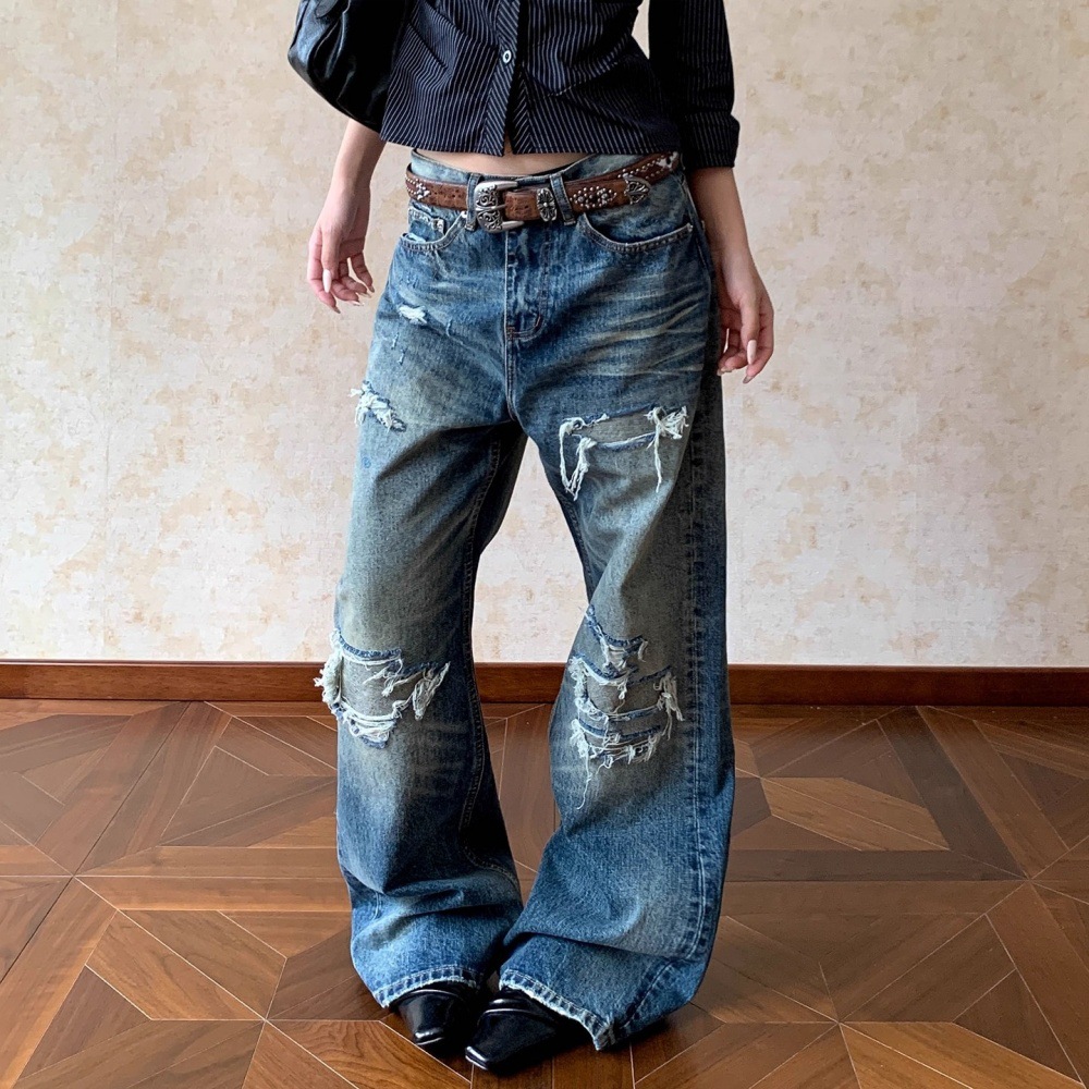 美式复古水洗做旧磨边破洞补丁猫须牛仔裤男女设计感直筒宽松裤子
