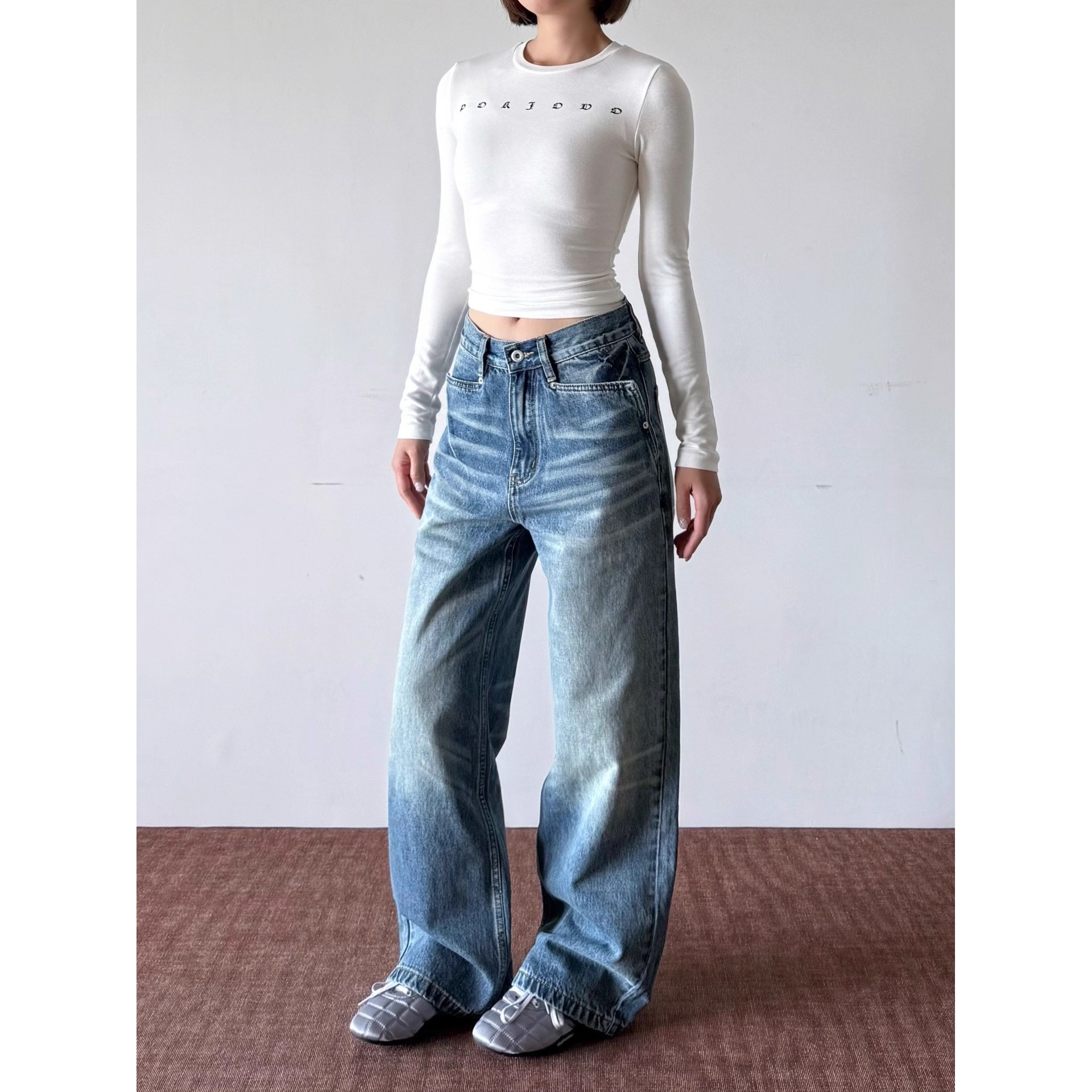 美式复古猫须水洗牛仔裤男女cleanfit宽松直筒设计感阔腿休闲裤子
