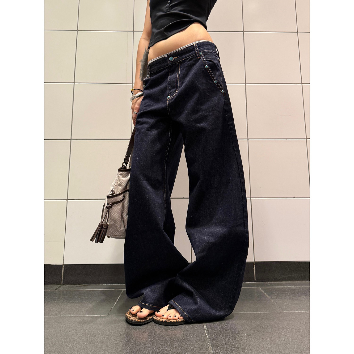 美式复古辣妹深蓝色阔腿弯刀牛仔裤男女新款宽松显瘦百搭直筒长裤