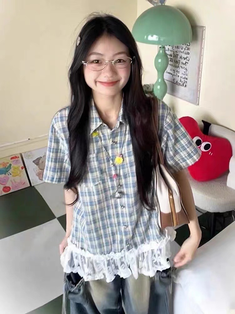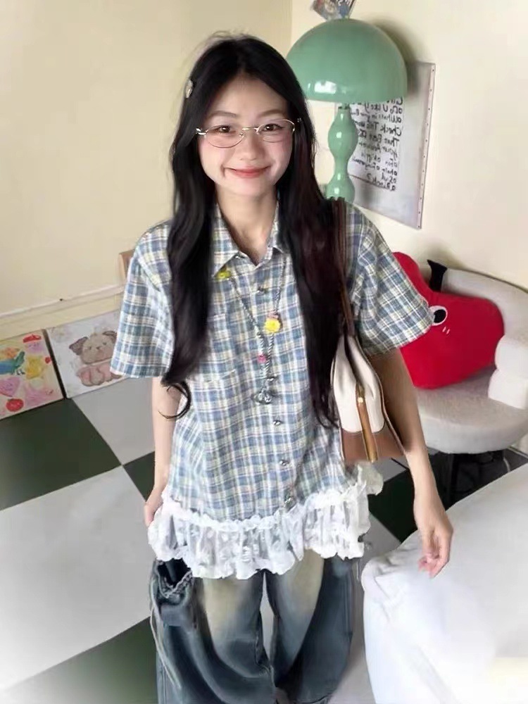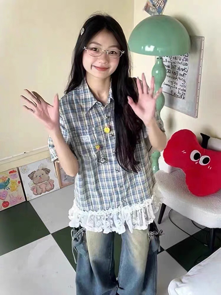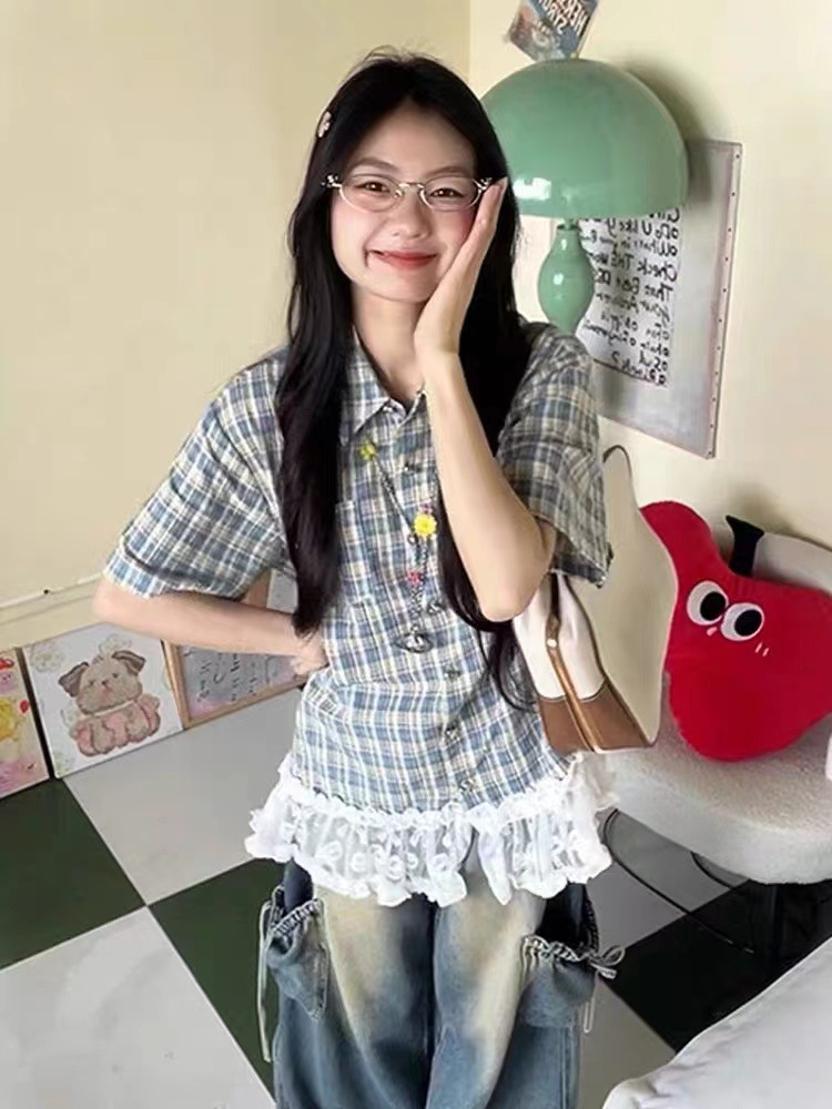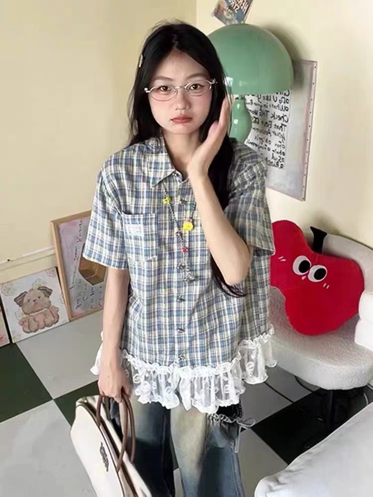 大きいサイズのチェック柄シャツ半袖レディース夏服パッチワークレースシャツルーズカジュアルカレッジスタイルトップトレンディ