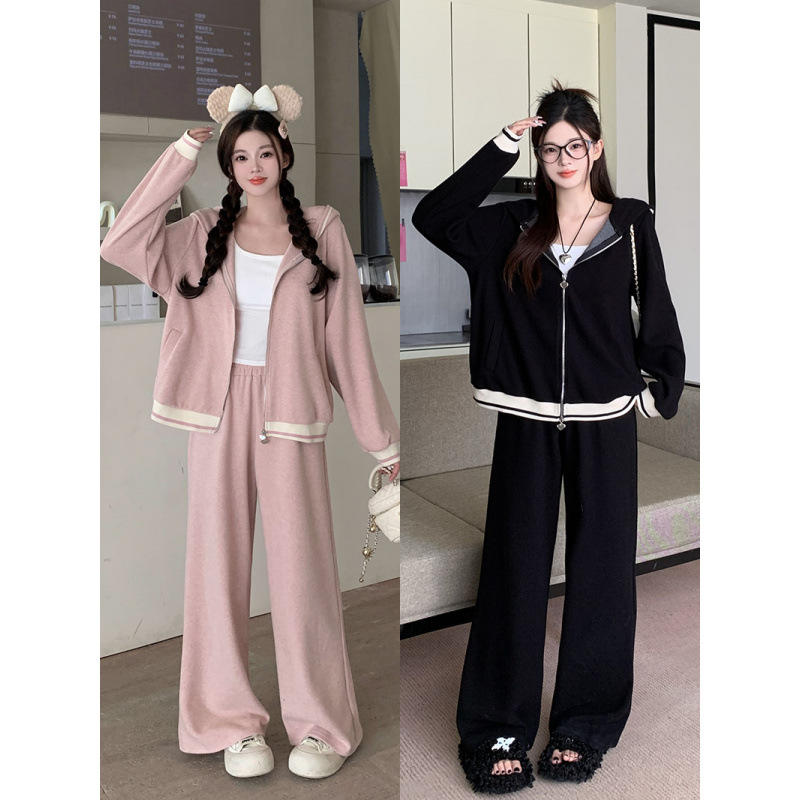2025春の服の新型の太ったmmの大きいサイズの女性の怠惰な風は色を厚くして帽子のオーバーの広い足のズボンの2つのセットにぶつかります。