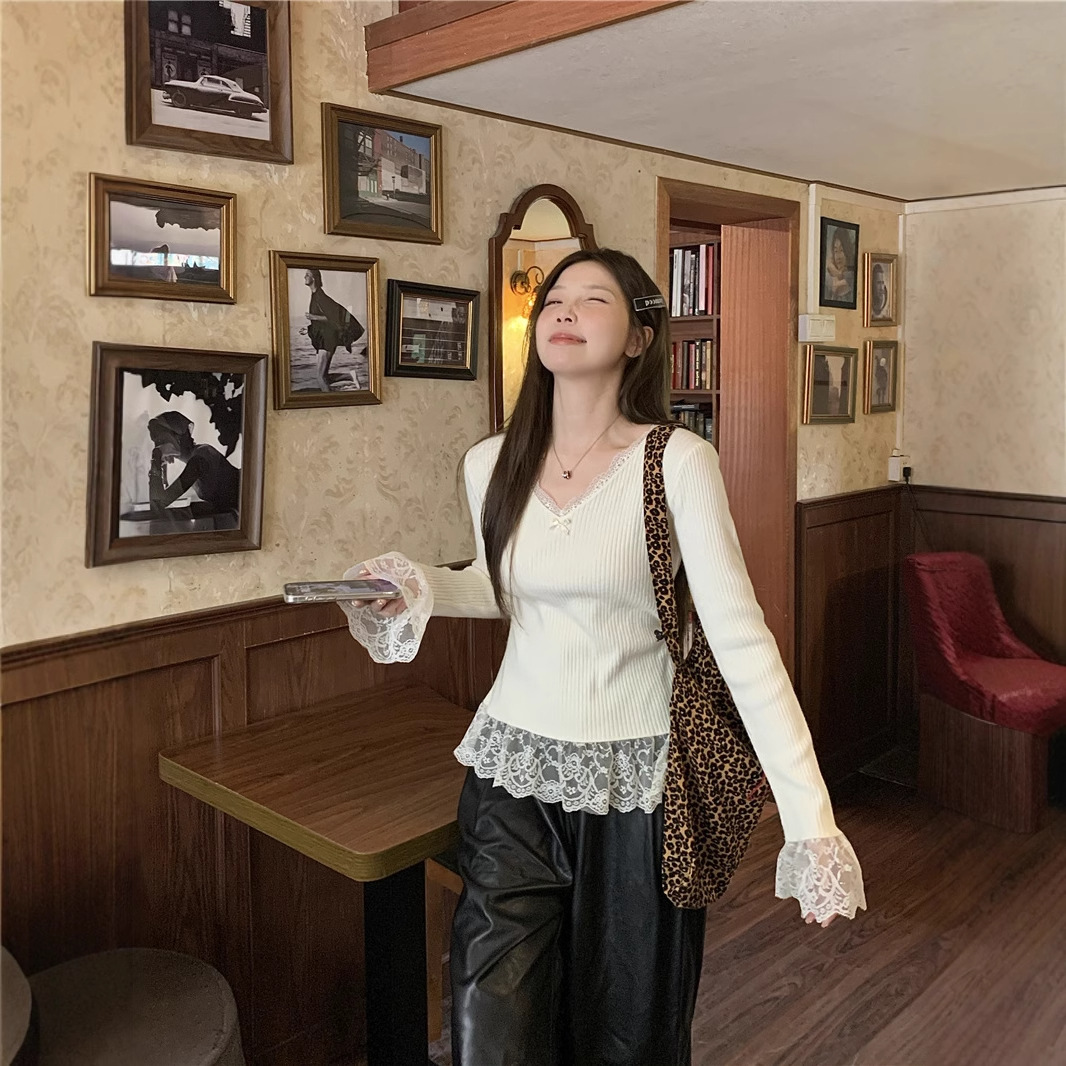 大きいサイズの女装純欲バレエ風vネックはレースのニットの秋冬をつづり合わせて上着を重ねて底のシャツを着ます。