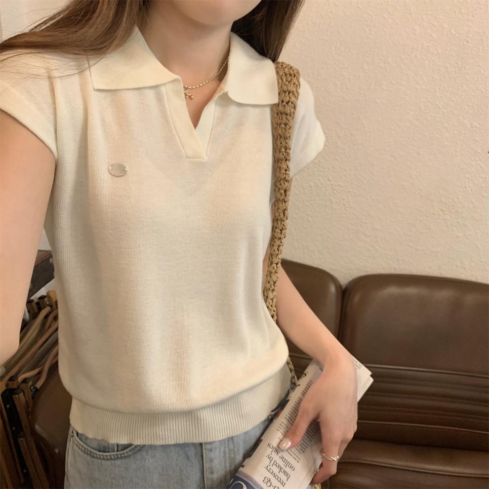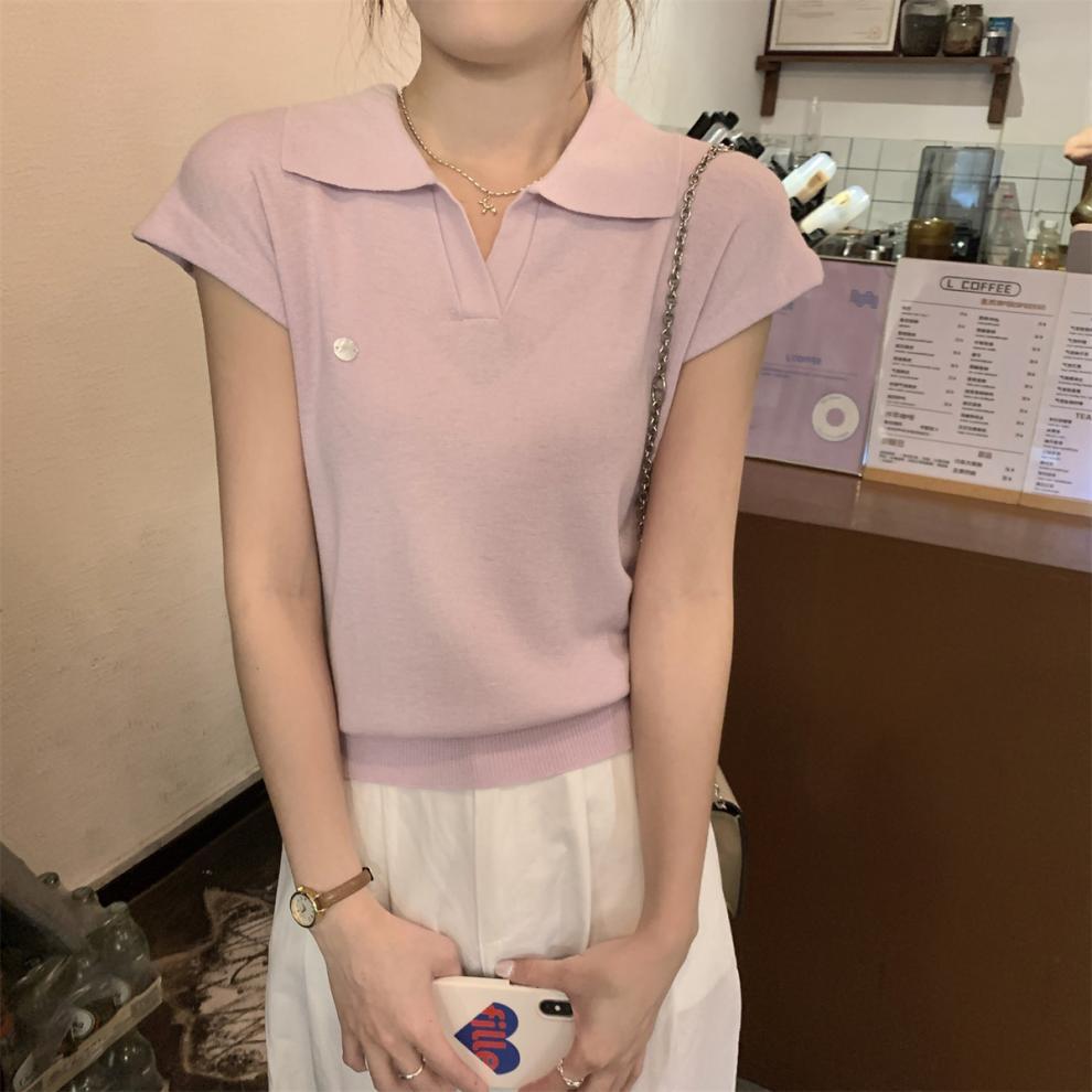 実物写真と実際の価格、夏の韓国風ポロカラー、シンプルで万能な6ウールの軽いニットセーター半袖トップス