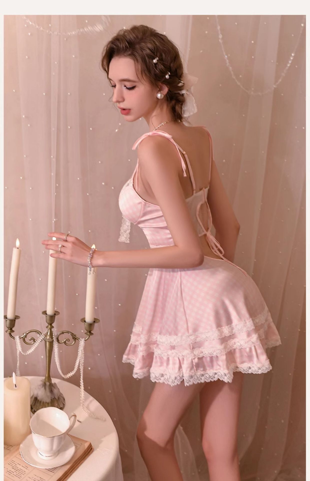 バラのような長いタイプのレースのガーターの睡眠のスカートの甘くて快適なパジャマのストラップの上着の純色の女性の部屋の服のスーツの2222