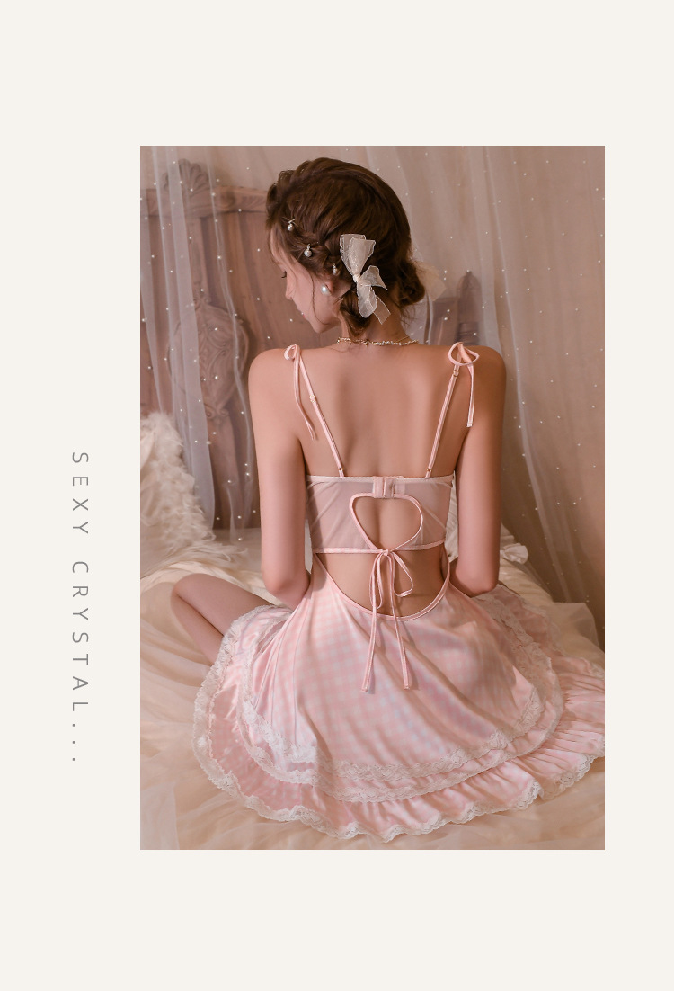 Meiliiko 新しい純粋な欲望スタイルの小さな胸のショートスカートエンボスフラワー中空レースメッシュサスペンダーパジャマセット 2247