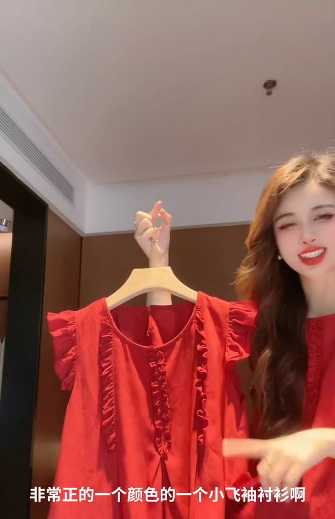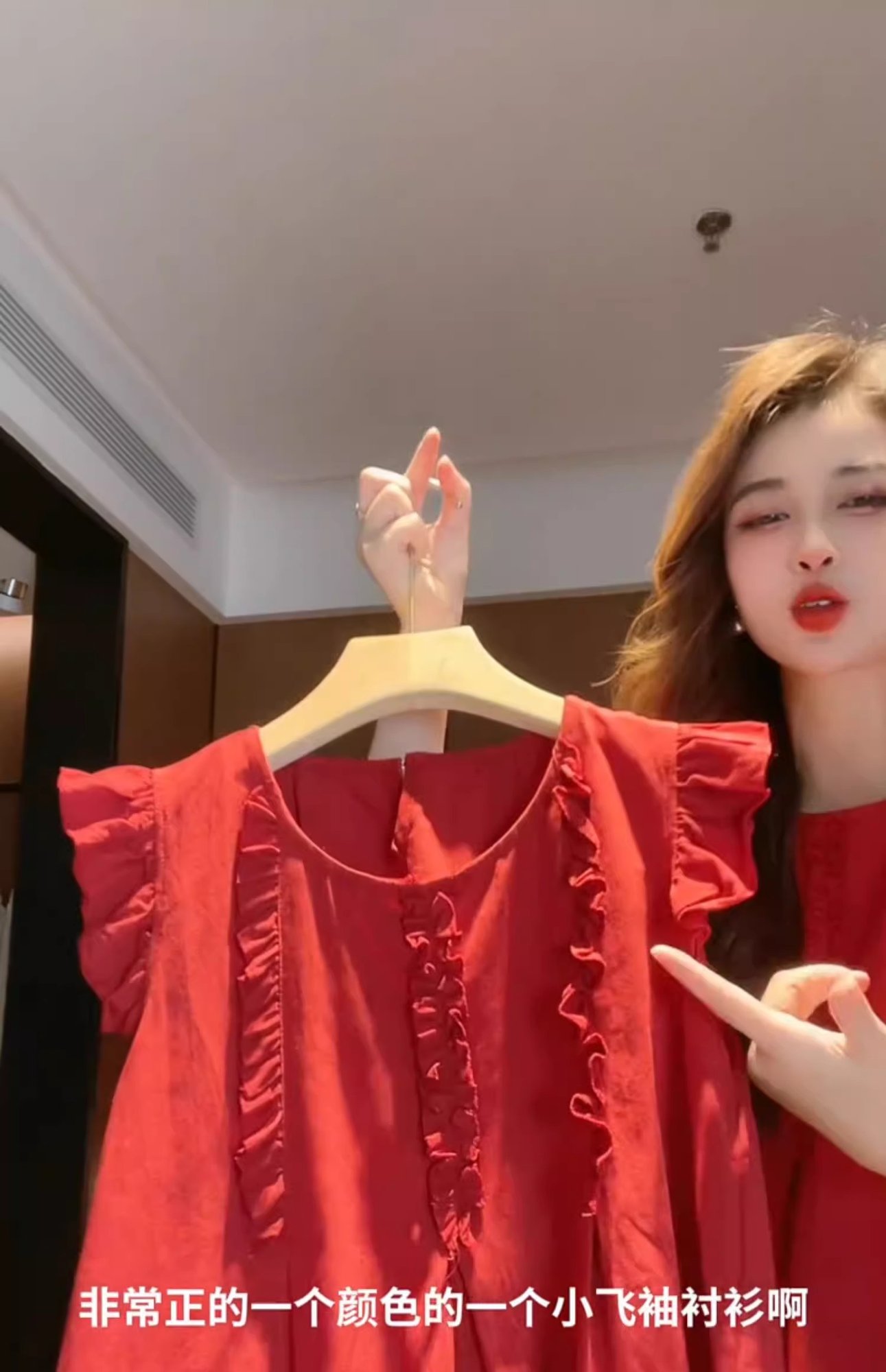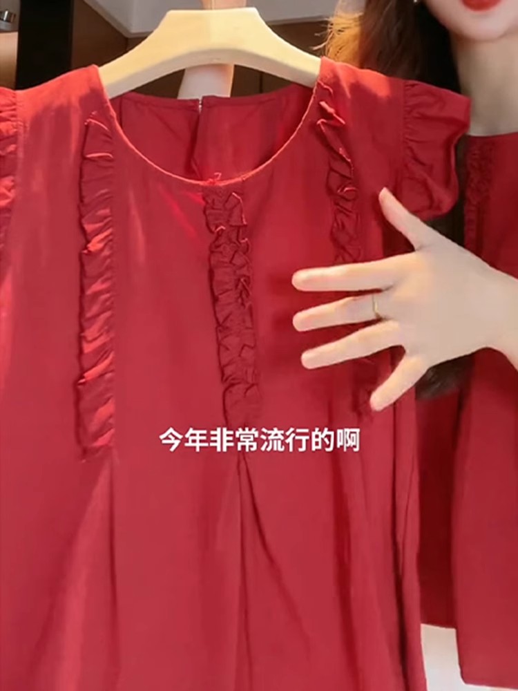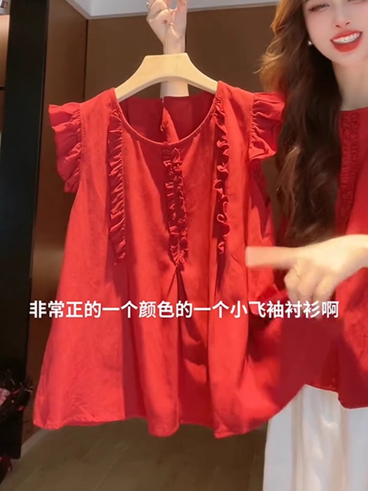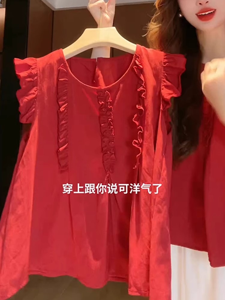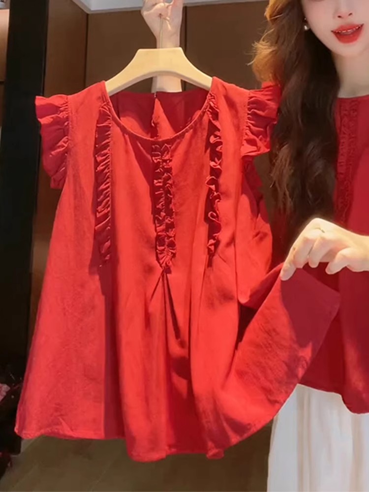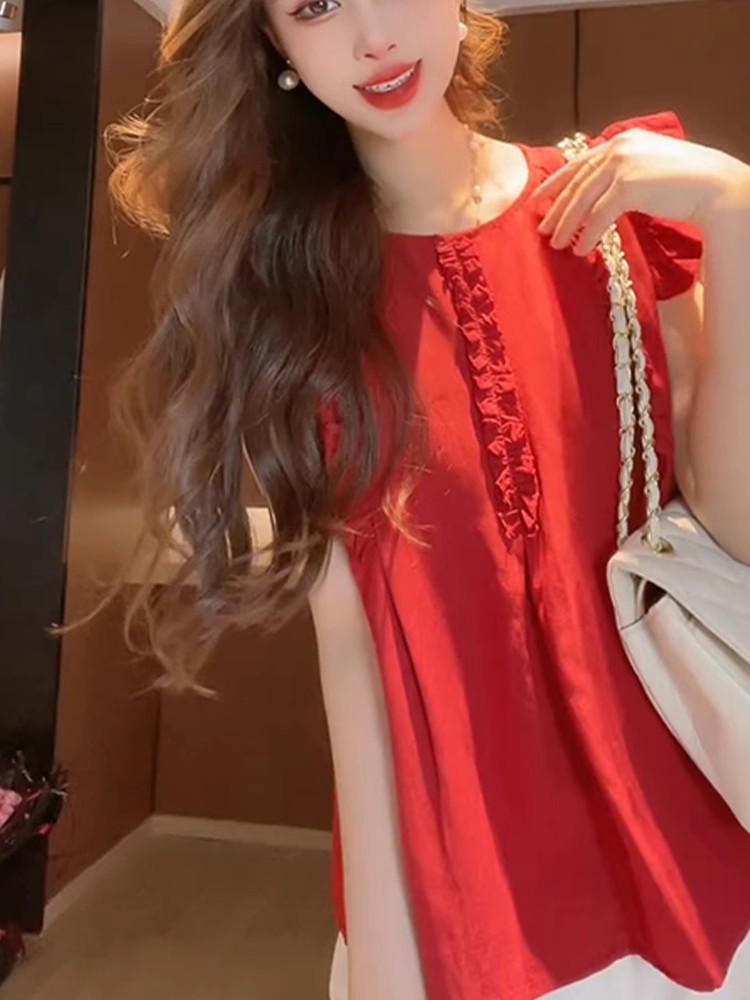 女性用の赤い袖のシャツ、夏の美しいベビードールシャツ、フレンチトップ