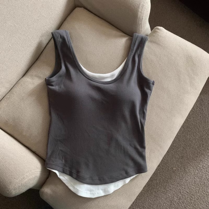 女性用フェイクツーピースベスト、胸パッド付きグレー、夏用アウター、胸をカバーし露出を防ぐ、I字型サスペンダーブラ、ノースリーブトップ
