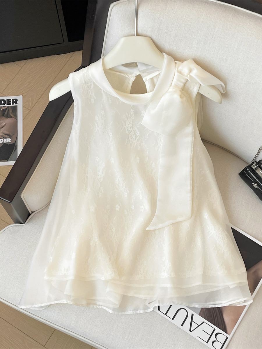 フランスの高級ジャカードシフォンシャツレディース夏の新しいスタイルのリボンノースリーブベストルーズで多用途なトップ