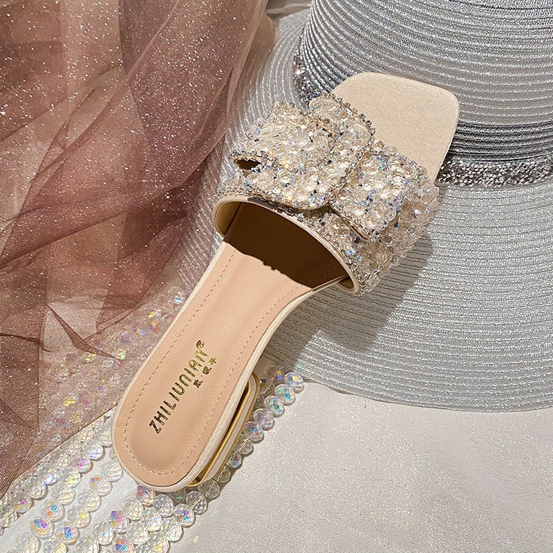 水钻花朵女士高跟拖鞋方头露趾粗跟时尚派对配裙子女式高跟凉鞋女