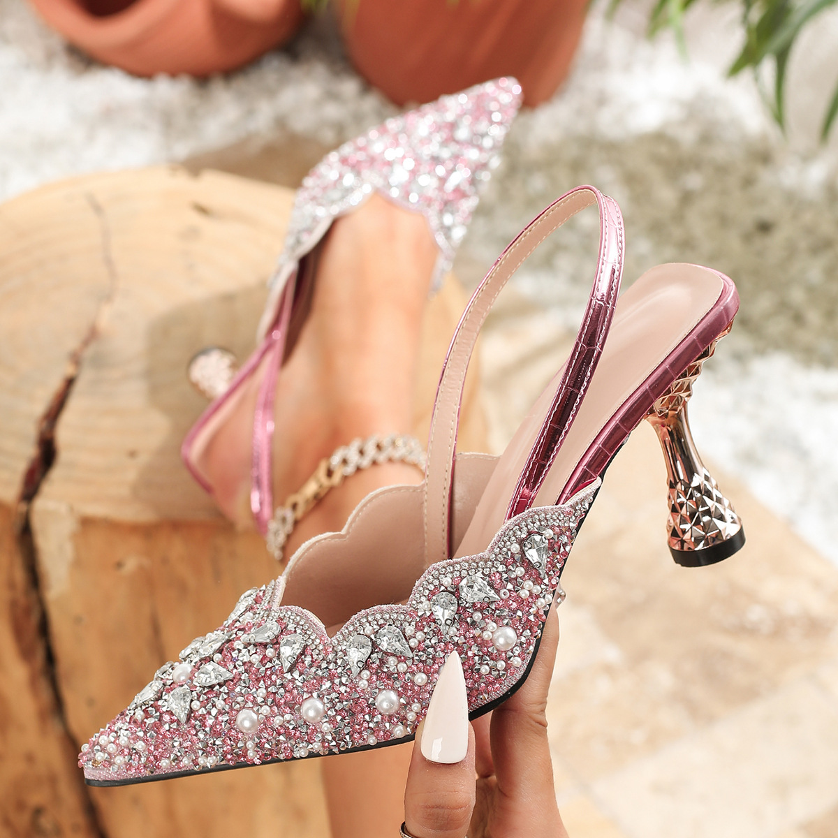 2025年夏 ラインストーン付きハーフスリッパ バックル付きサンダル ハイヒールスリッパ レディース 外履き 異形ヒール ポインテッドトゥ スクエアヒール スティレットヒール