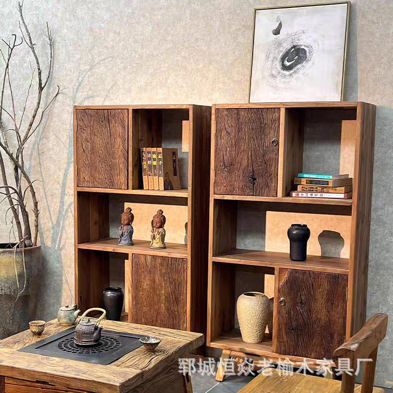 侘寂风实木书柜客厅落地储物柜复古老榆木收纳柜民宿酒店展示柜