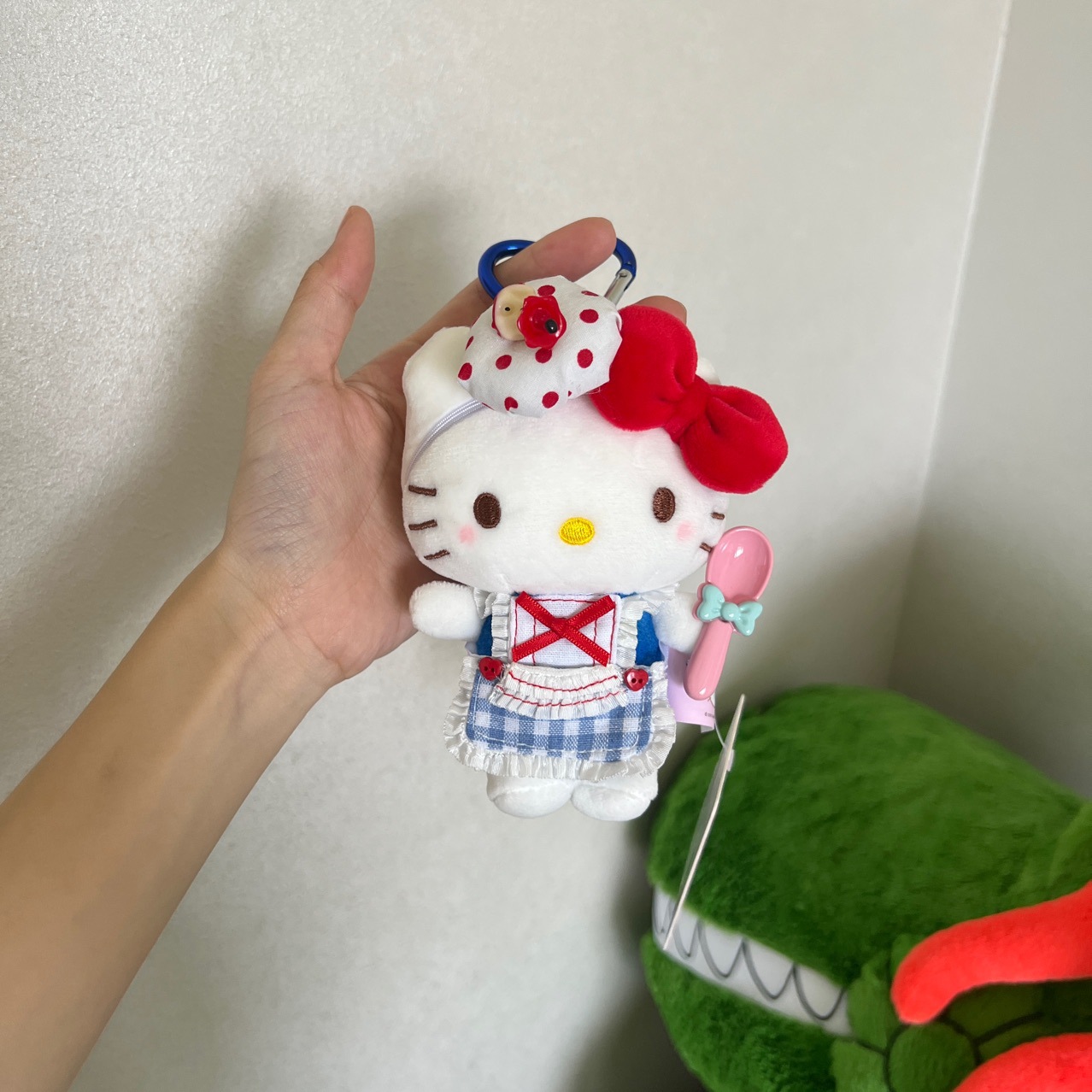 ミントのマンボの中古ハローキティのかわいいぬいぐるみのペンダントの横に座っています。
