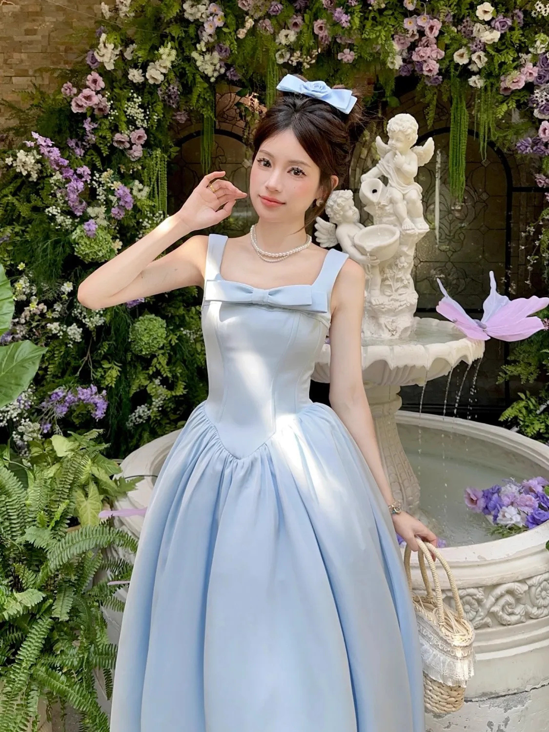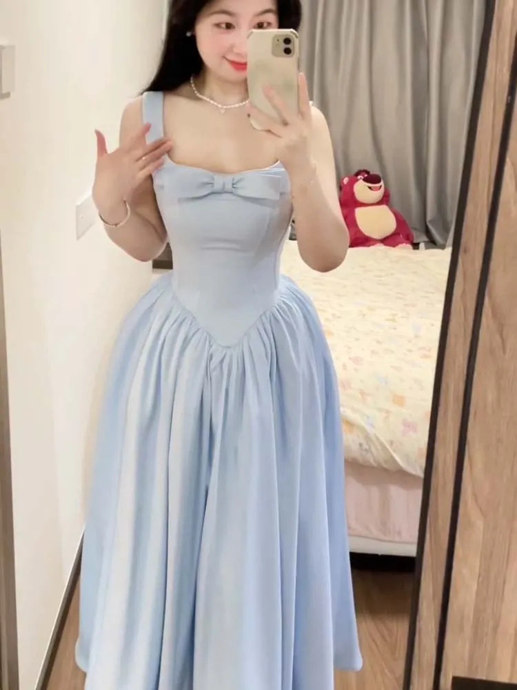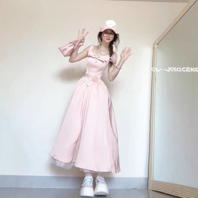 夏季新款甜美度假风粉色蝴蝶结公主初恋感显瘦收腰背带连衣裙女装