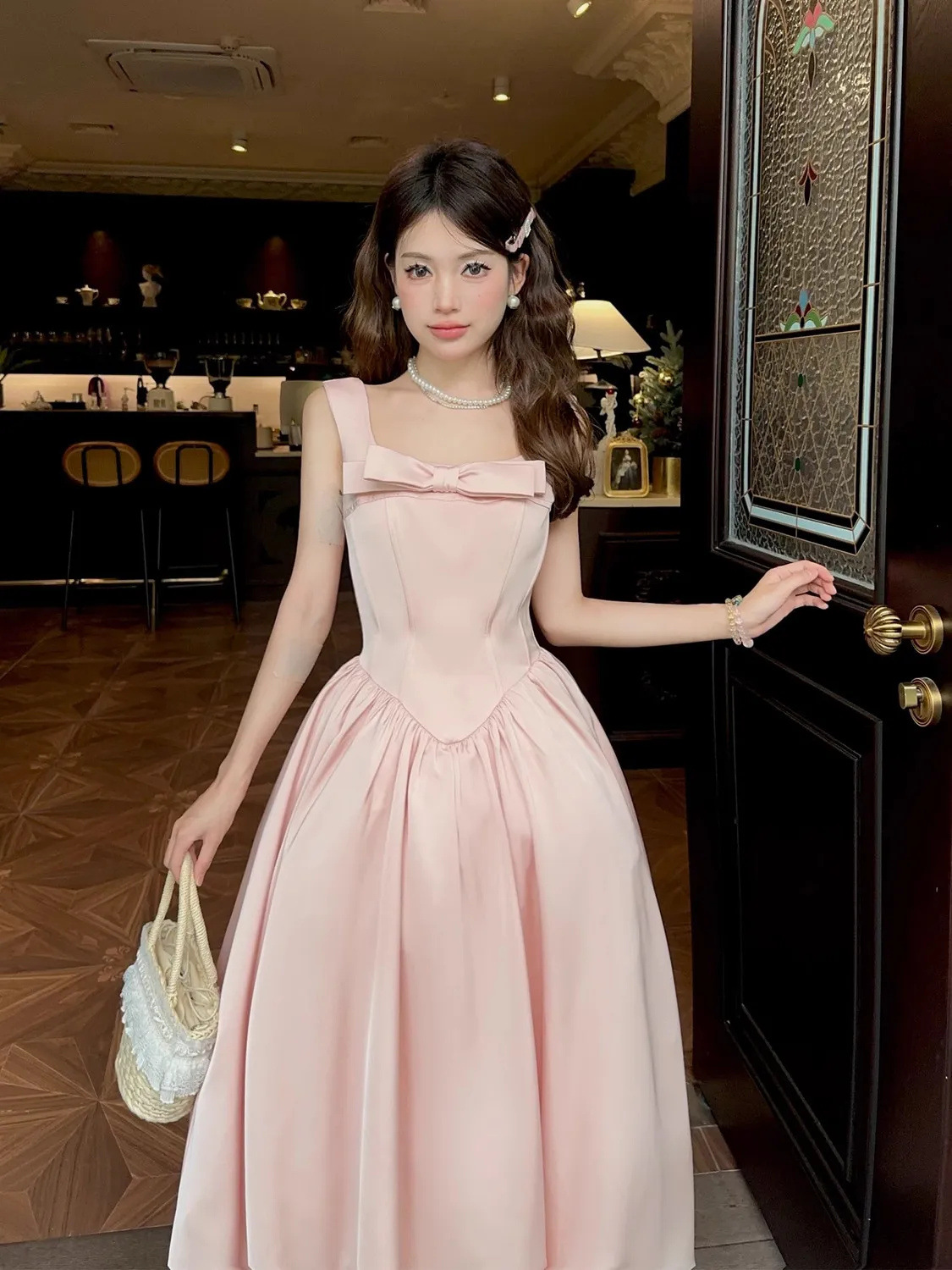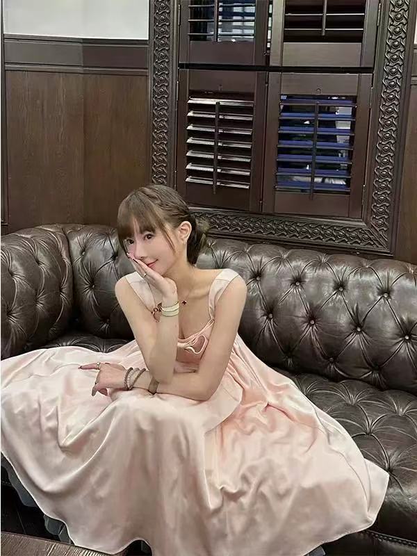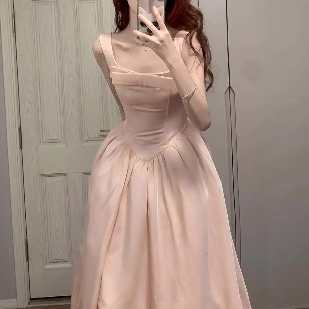フレンチピンクのサスペンダーウエストAラインスクエアカラーライトドレスフィッシュボーンドレスレディースロングハイウエスト夏