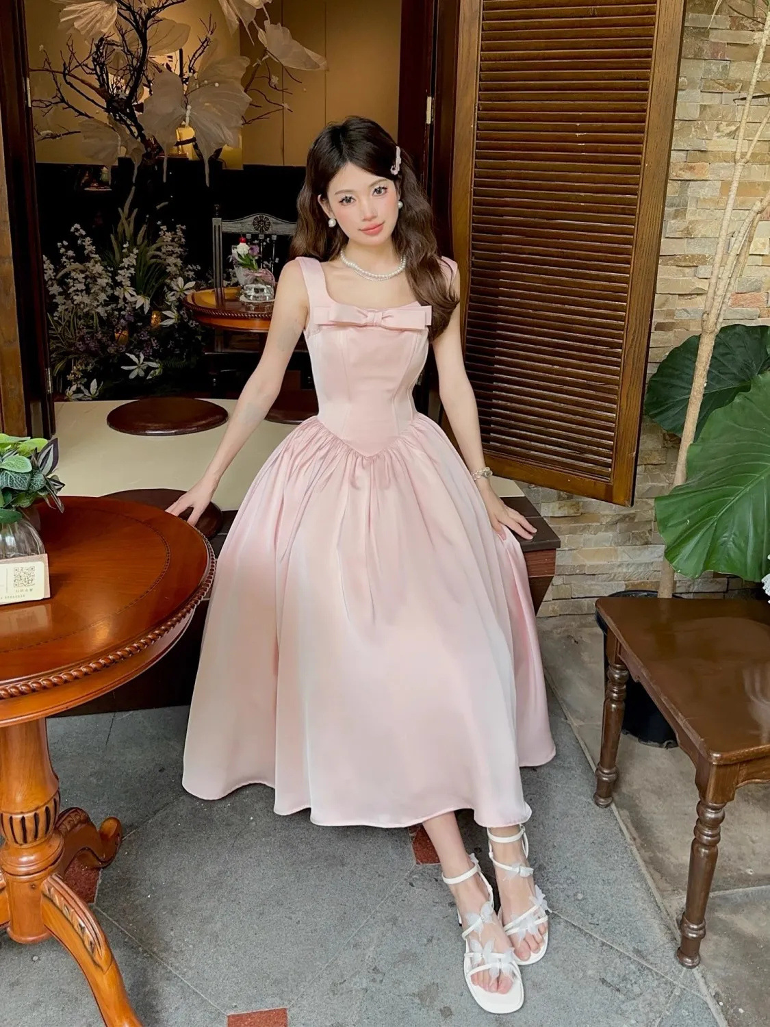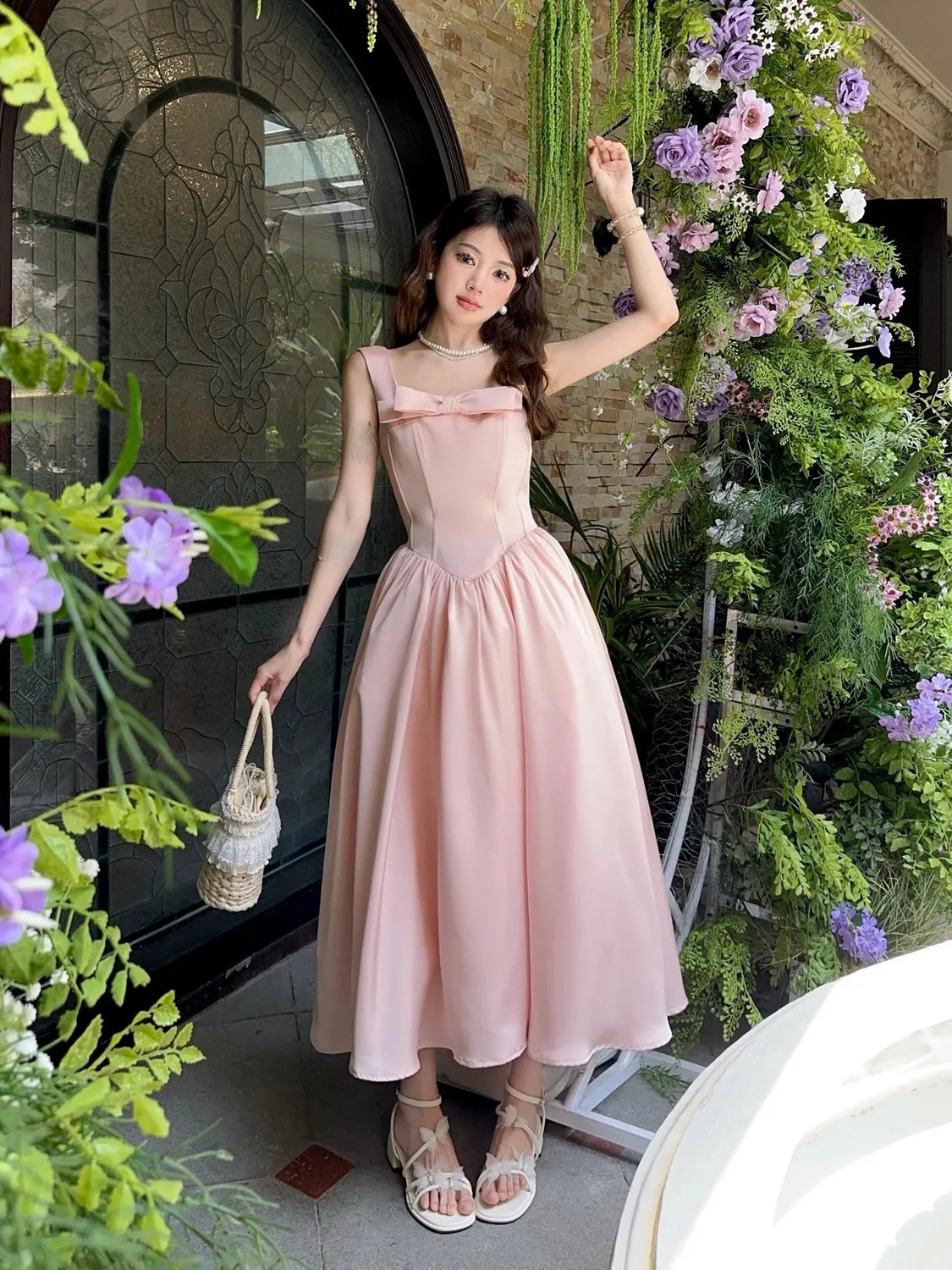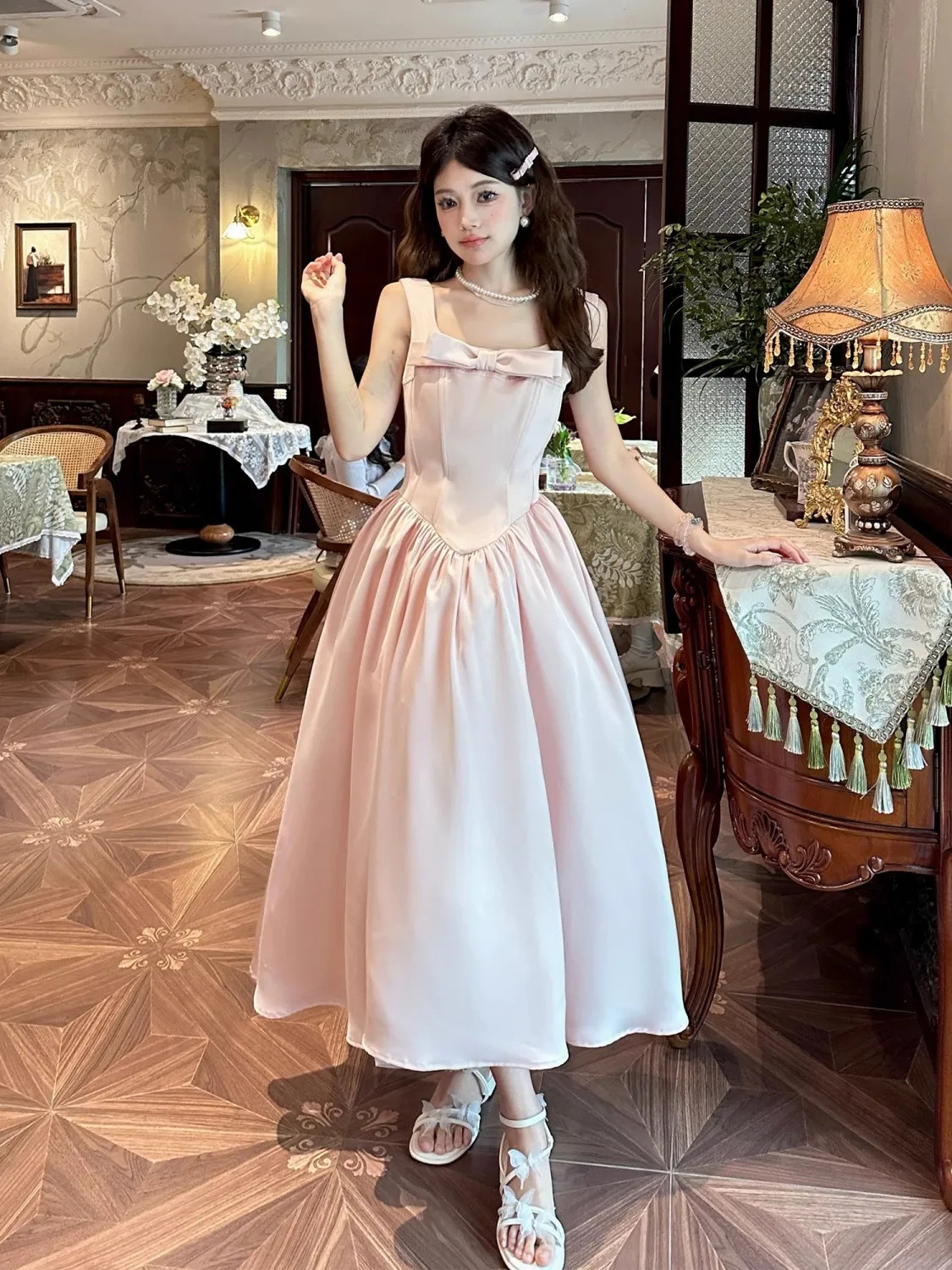 フレンチピンクのサスペンダーウエストAラインスクエアカラーライトドレスフィッシュボーンドレスレディースロングハイウエスト夏