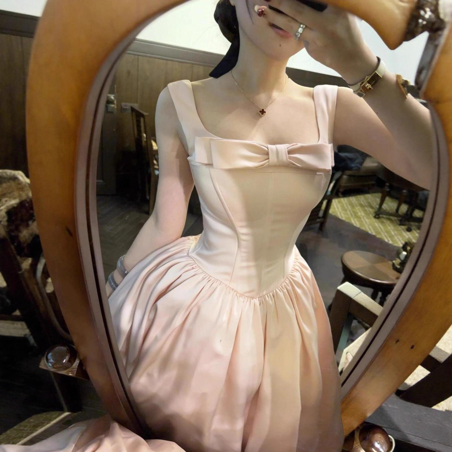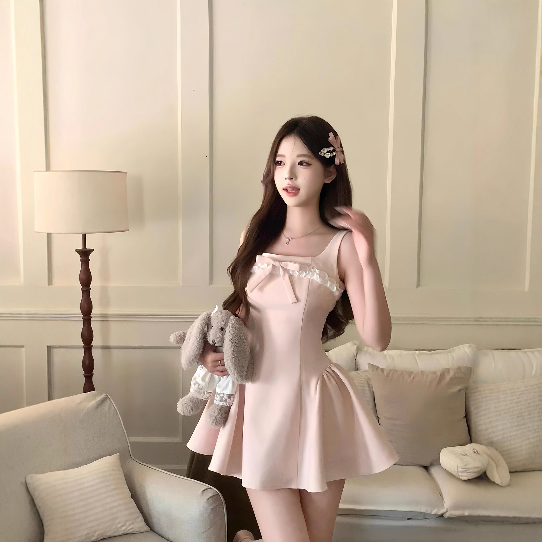 【内里带网纱】法式粉色蝴蝶结连衣裙女生夏季收腰气质超仙显瘦长