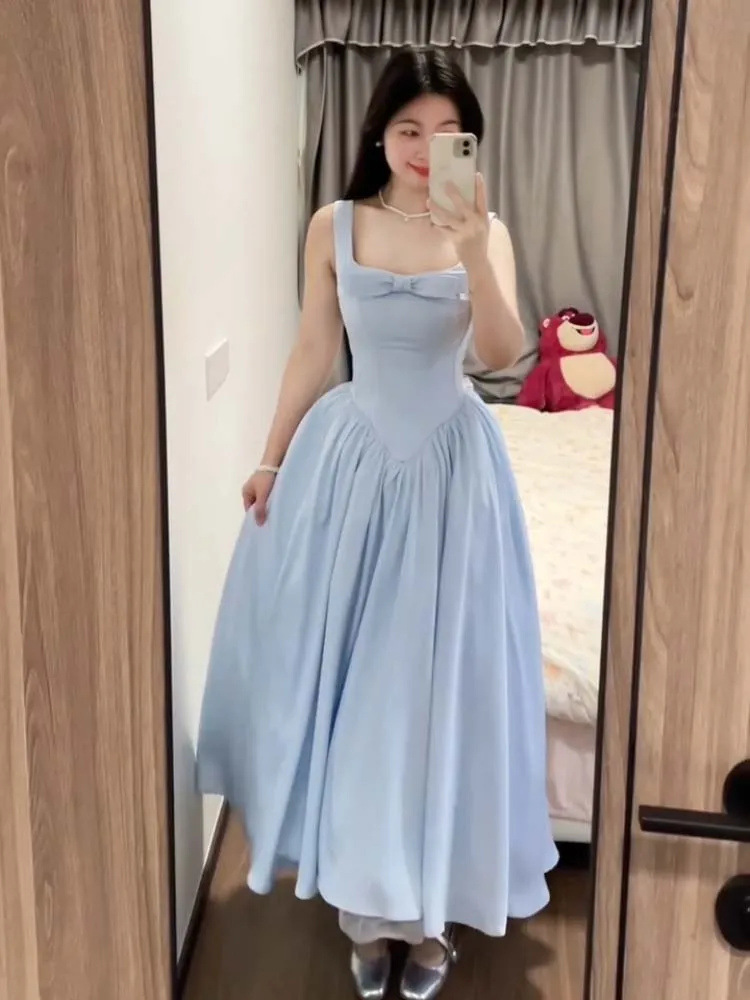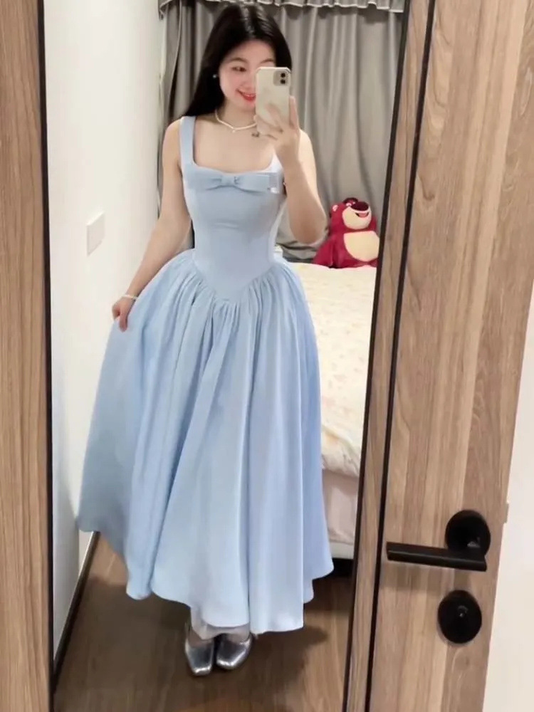 フレンチピンクのリボンスクエアネックドレス女の子のための夏2025新しいウエスト痩身気質スーパーフェアリーロングスカート