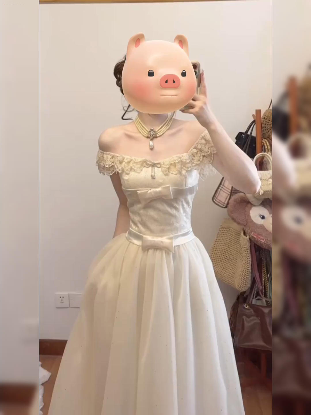 珍珍家 フレンチミルク系 ホルターネック プリンセスドレス ロングドレス 細見えドレス パール付きイブニングドレス ハイウエスト 細見え