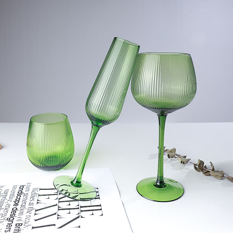 工厂直售原色料多彩人工吹制竖纹水晶玻璃红酒杯/香槟杯/水杯套装