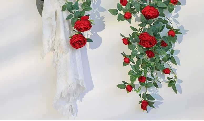 花のバラの花の偽の花の藤の条のネットの赤い写真をシミュレーションしてカードの背景の壁を飾って壁を飾って壁面の扉のパイプを掛けます。