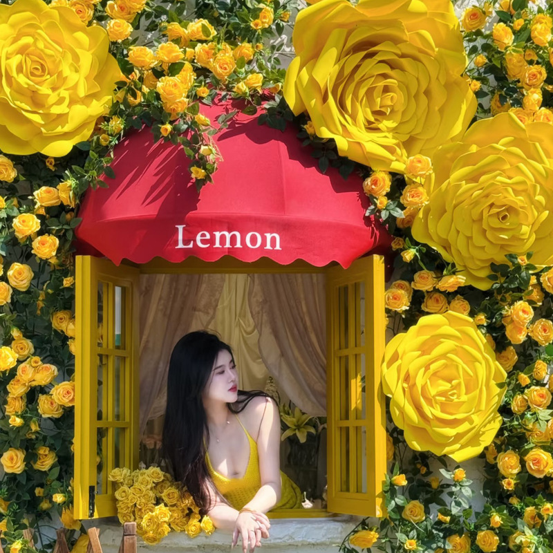 ネットの赤い黄色のバラの花の壁のシミュレーションの花藤の食事の民宿のショーウインドーの入り口の造景は花の芸の黄亦のバラを飾ります。