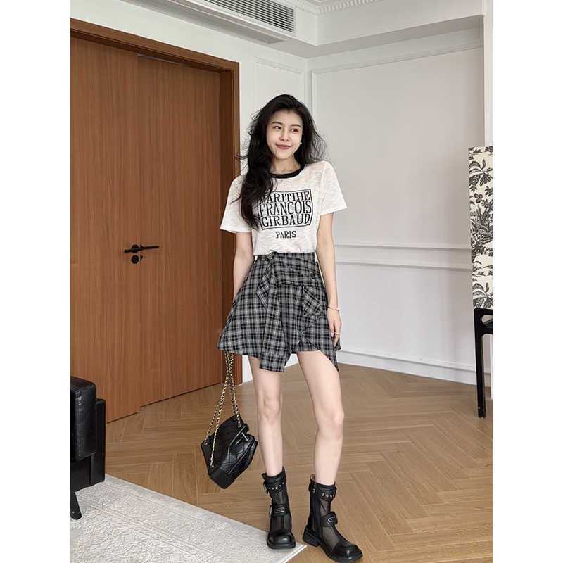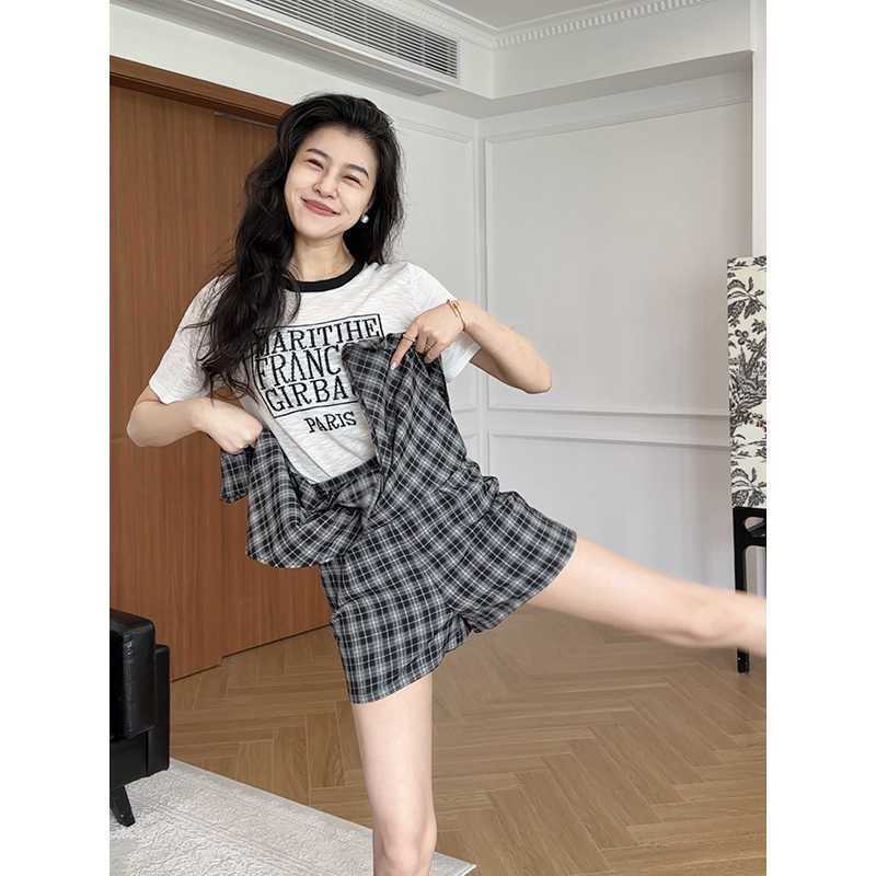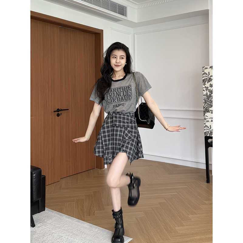 プラスサイズファットmm夏新作薄手ニット半袖+スリム不規則チェック柄スカートパンツスリムツーピーストレンドセット
