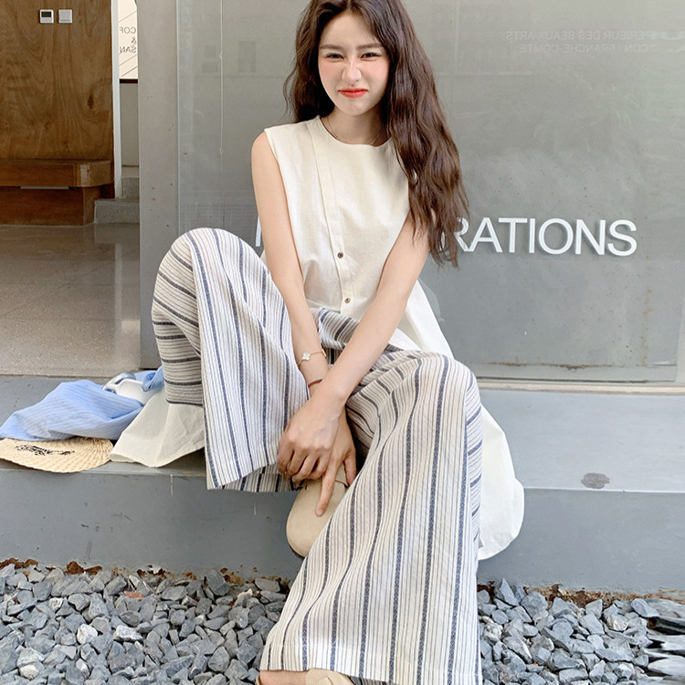 デザイン感小衆レジャースポーツスーツ女性夏ノースリーブ引きひも上着薄手工装ワイドパンツ2点セット